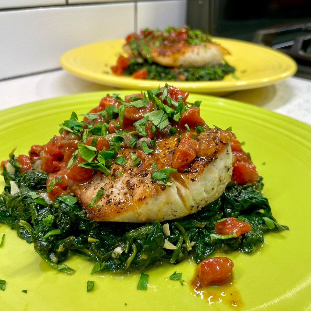 Today’s recipe is a twist on Mahi Hemingway, a dish I posted a few years ago, and my copycat version of a pricey meal I had enjoyed many times at a local restaurant. This time, I’ve plated the fish and sauce atop fresh spinach rather than a pile of carb-y pasta. It’s colorful, easy to prepare and absolutely delicious!