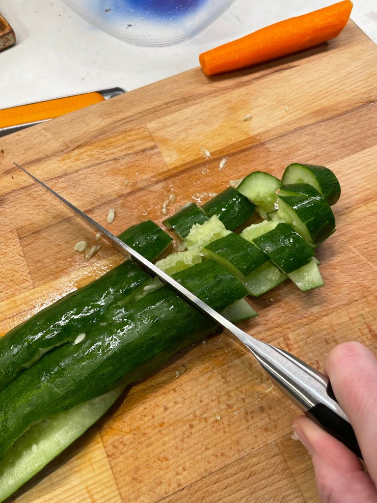 English cucumber is ideal for this type of salad, for its smaller seeds and thinner skin. My grocery stores all sell this type of cucumber, but usually they have a waxy coating to keep them fresh during transport from God-knows-where (yet another reason to choose local). You can use anything you have on hand for smashing it— the flat side of a chef’s knife, bottom of a skillet, whatever— but don’t use a heavy hand unless you want cucumber juice all over yourself and the kitchen. Just enough to crack it open is good, and then use a knife to cut the smashed cucumber into generous chunks. Season it, and toss with the other ingredients. Could it be more simple?