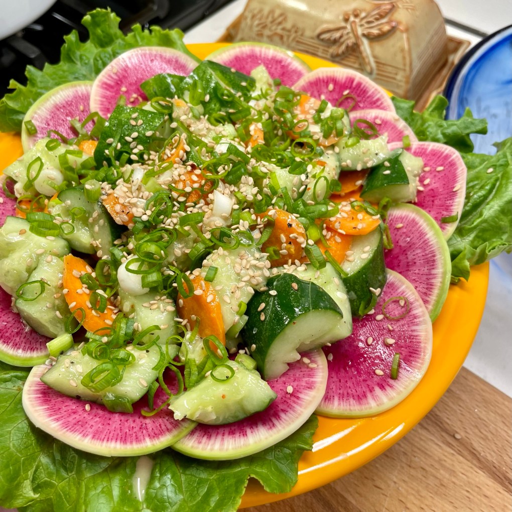 Arrange lettuce leaves and watermelon radish on a serving platter. Spoon the smashed cucumber salad onto the plate and garnish with reserved scallion tops and sesame seeds.