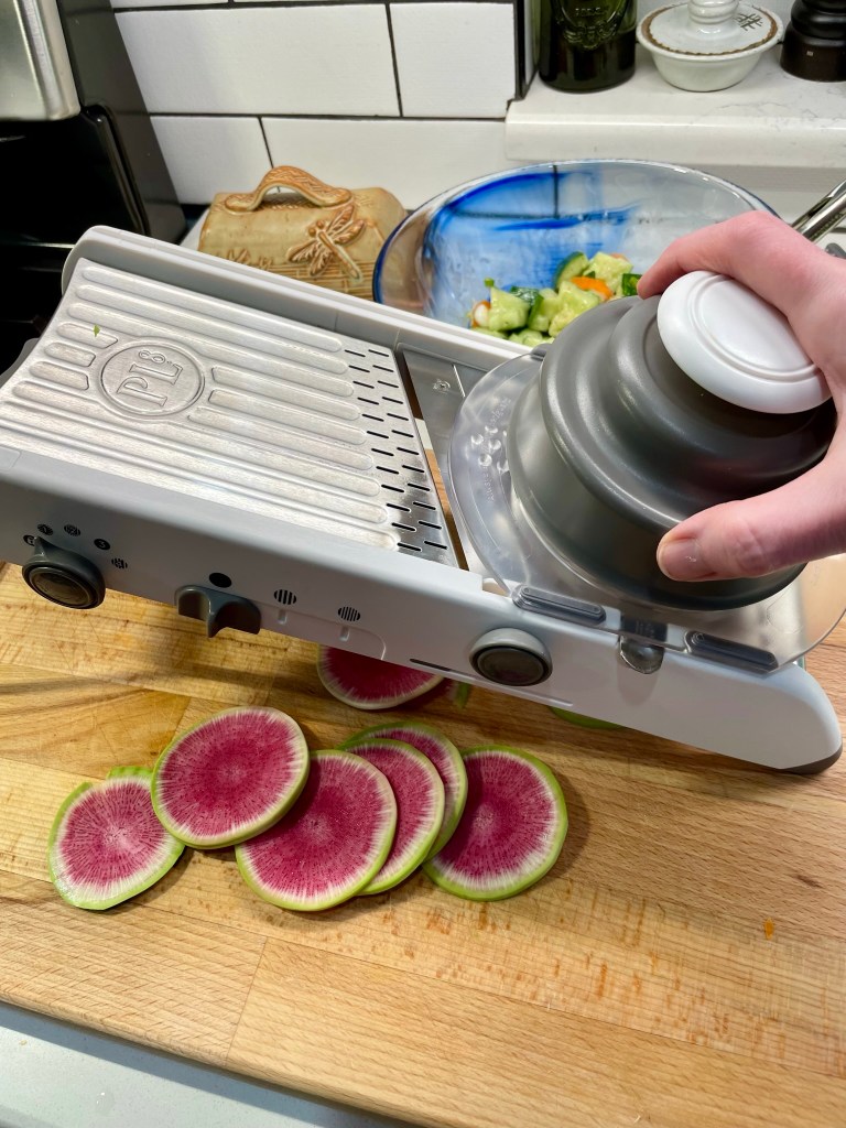 The most brilliant element of this dish— and I mean brilliant in the sense of “wow, look at that shocking pink color!”— is the watermelon radish. That neon pink color seems to be everywhere right now, thanks to the Barbie movie, and though I’ve seen these radishes in food magazines and cooking shows, I have never run across one in the supermarket.