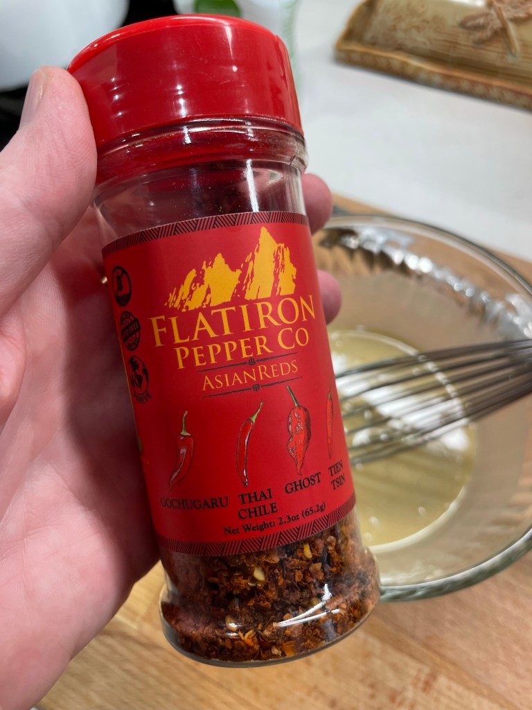 In a small bowl, combine miso, vinegar, tahini, sugar and lemon juice plus zest. Season to taste with salt and pepper. Add a few shakes of red pepper flake if you want a bit of heat. I like Flatiron Pepper Company’s Asian Reds here.