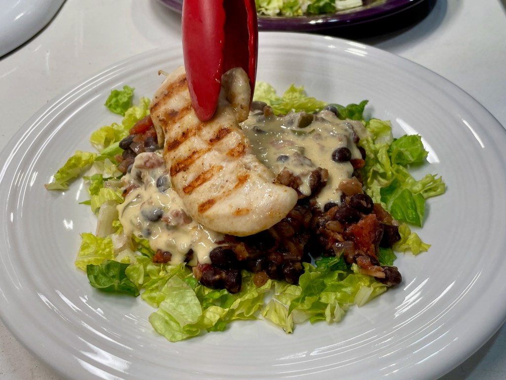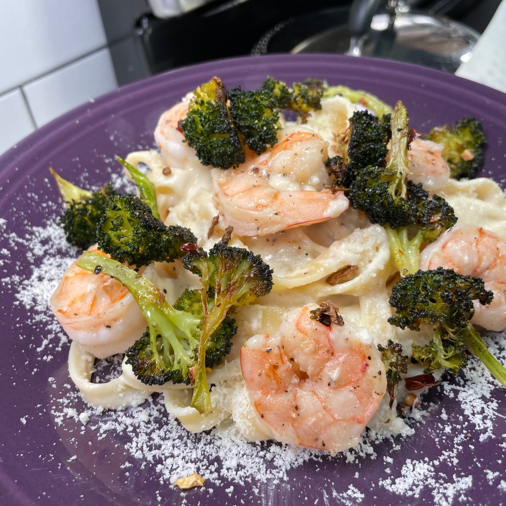 Leaning into whole grains helps me feel full longer. I love Bob’s Red Mill products!Fettuccine with shrimp and roasted broccoli. Link here for my “No-Guilt Alfredo Sauce,” made with loads of cauliflower!A leftover-based version of wedding soup, but I skipped the pasta and didn’t bother turning the ground chicken into meatballs.One of my all-time faves! Link here for the recipe for “Salmon with Fennel & White Beans.”Just a tablespoon of queso dip (leftover from Super Bowl) on this salad, topped with black bean-tomato hash and grilled chicken tenders.Breakfast for dinner always satisfies! Link here for my my “Shiksa-style Shakshuka!”