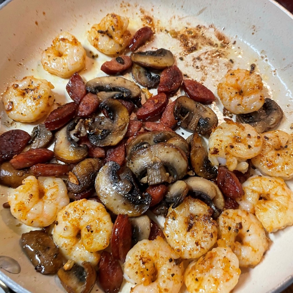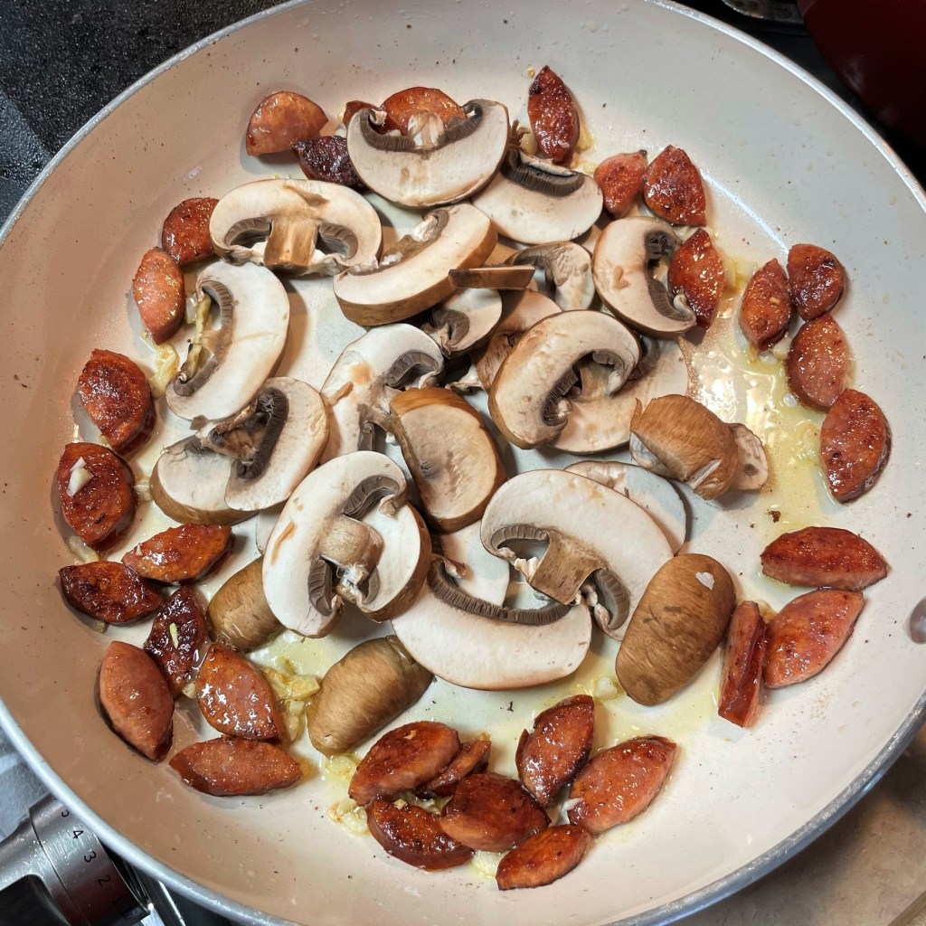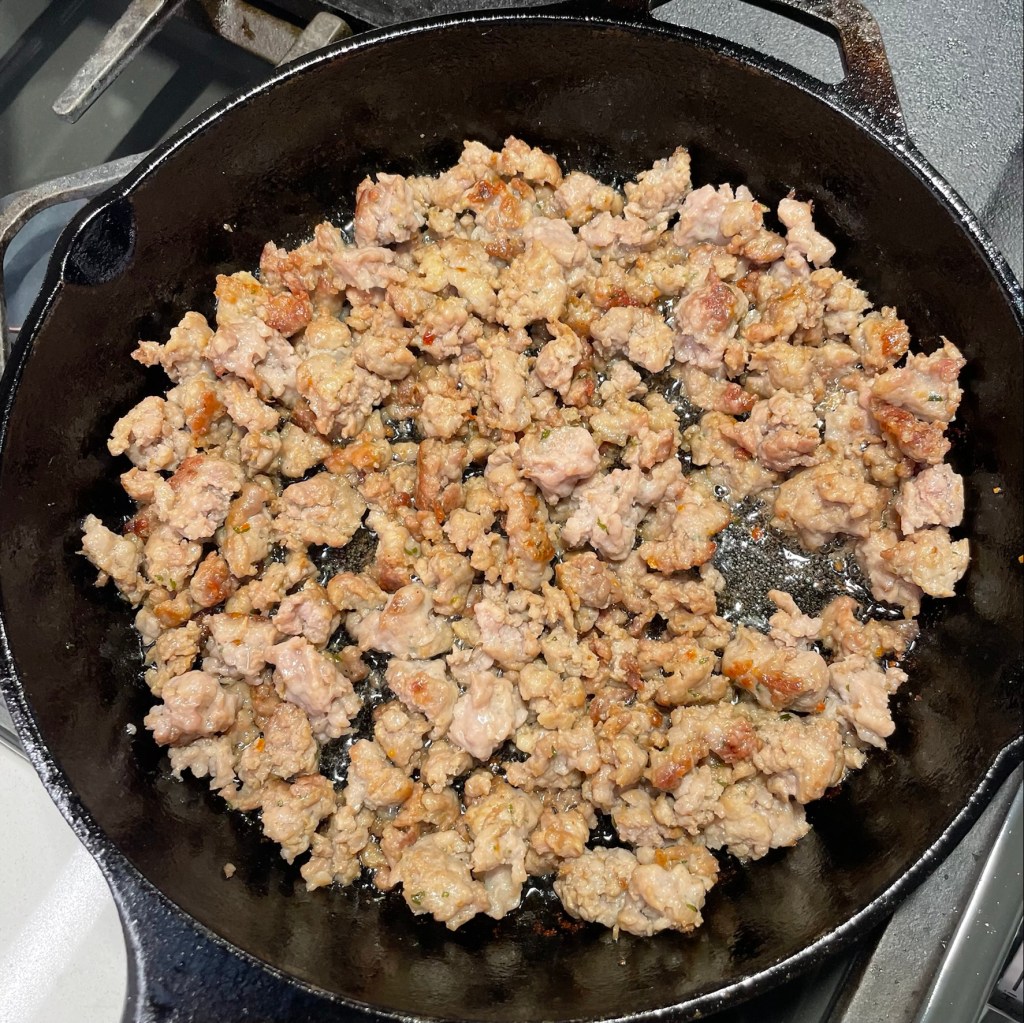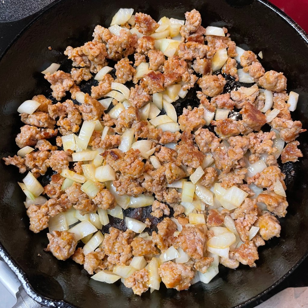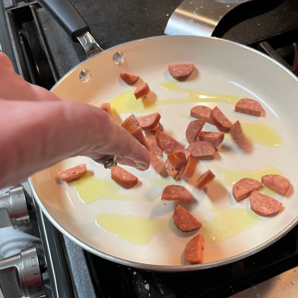 - Place a wide, shallow skillet or pot over medium heat. Add a swirl of olive oil and crumble up the sausage into the pan. Let it be for a couple of minutes before you toss it with a utensil, to allow browning to happen. Once the sausage begins to brown, add the onions and continue to cook until the meat is fully browned and the onions are tender. Add garlic and the smoky pepper seasoning. Transfer the sausage mixture to a separate bowl and set aside until after the next step.