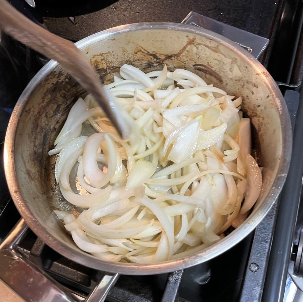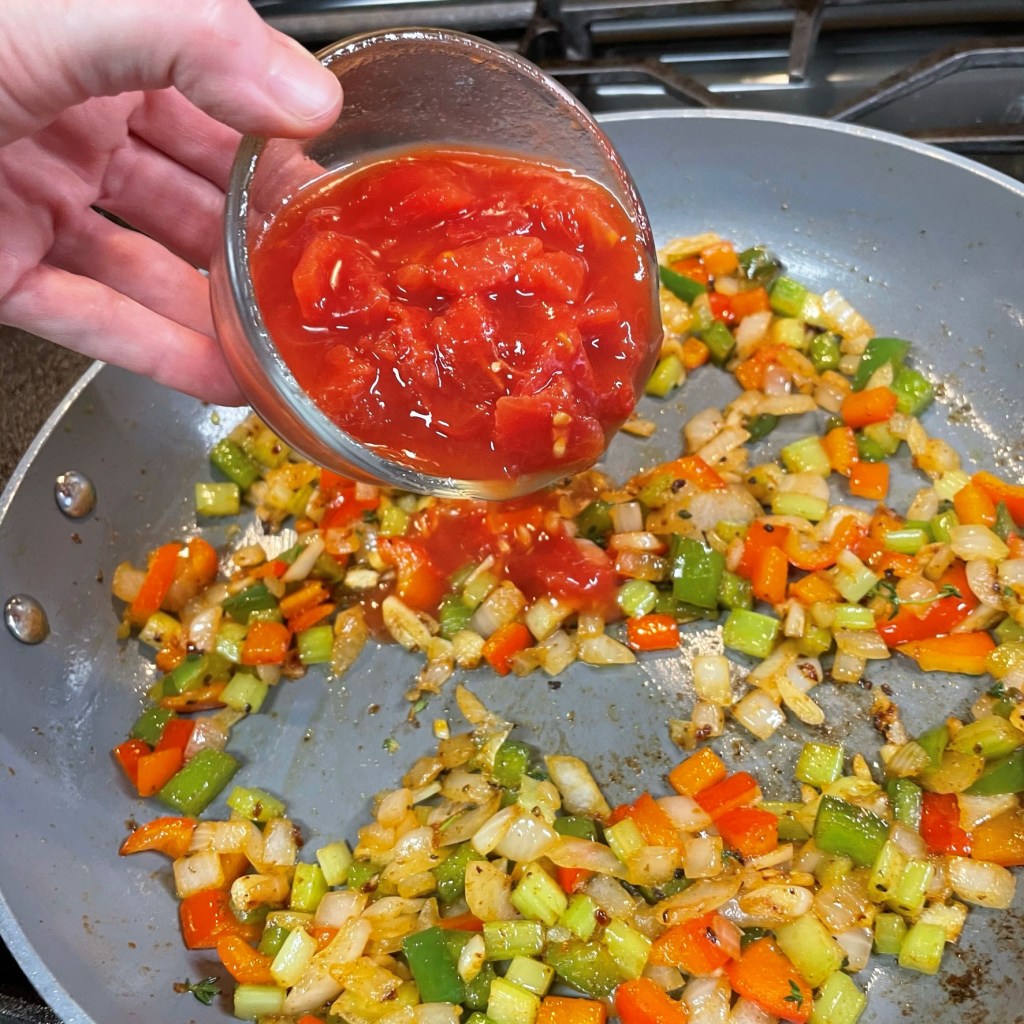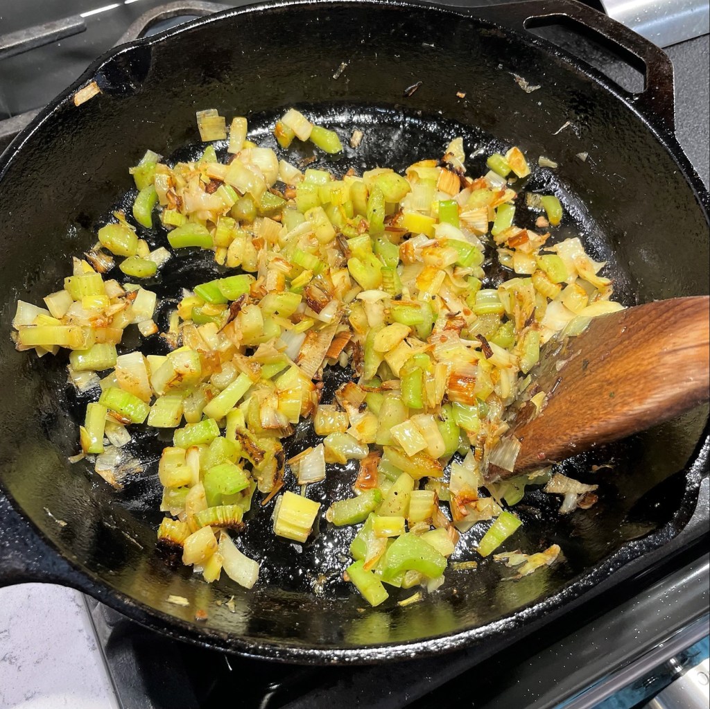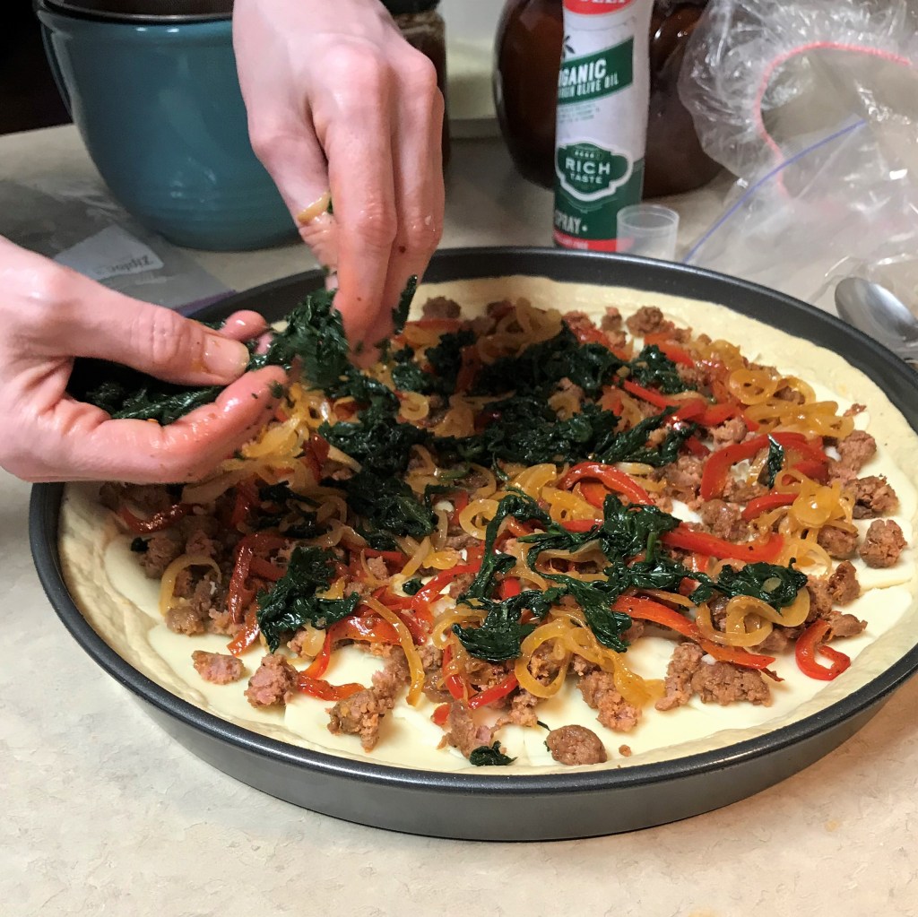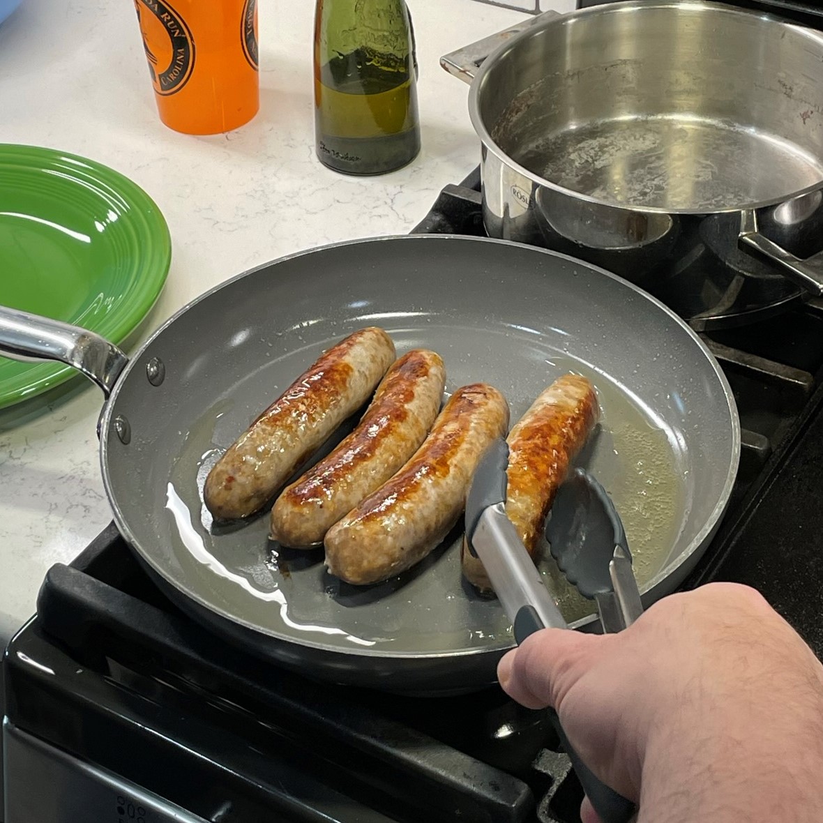 - Place a wide, shallow skillet or pot over medium heat. Add a swirl of olive oil and crumble up the sausage into the pan. Let it be for a couple of minutes before you toss it with a utensil, to allow browning to happen. Once the sausage begins to brown, add the onions and continue to cook until the meat is fully browned and the onions are tender. Add garlic and the smoky pepper seasoning. Transfer the sausage mixture to a separate bowl and set aside until after the next step.