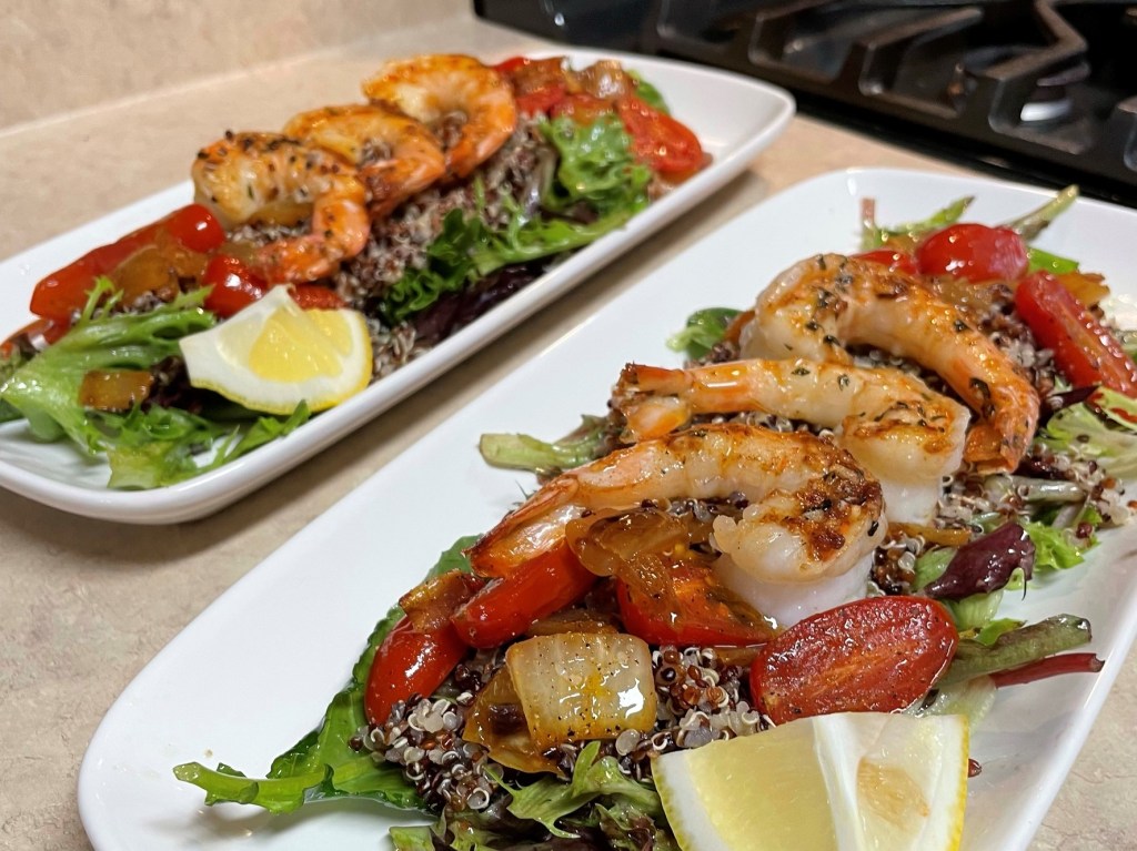 The third time, I used the same seasonings as the first batch of shrimp, but with green jalapeno. I cooked it in a plain skillet (with no additional oil) and laid it atop zucchini noodles with sautéed fresh tomatoes and onions. Brilliant!
