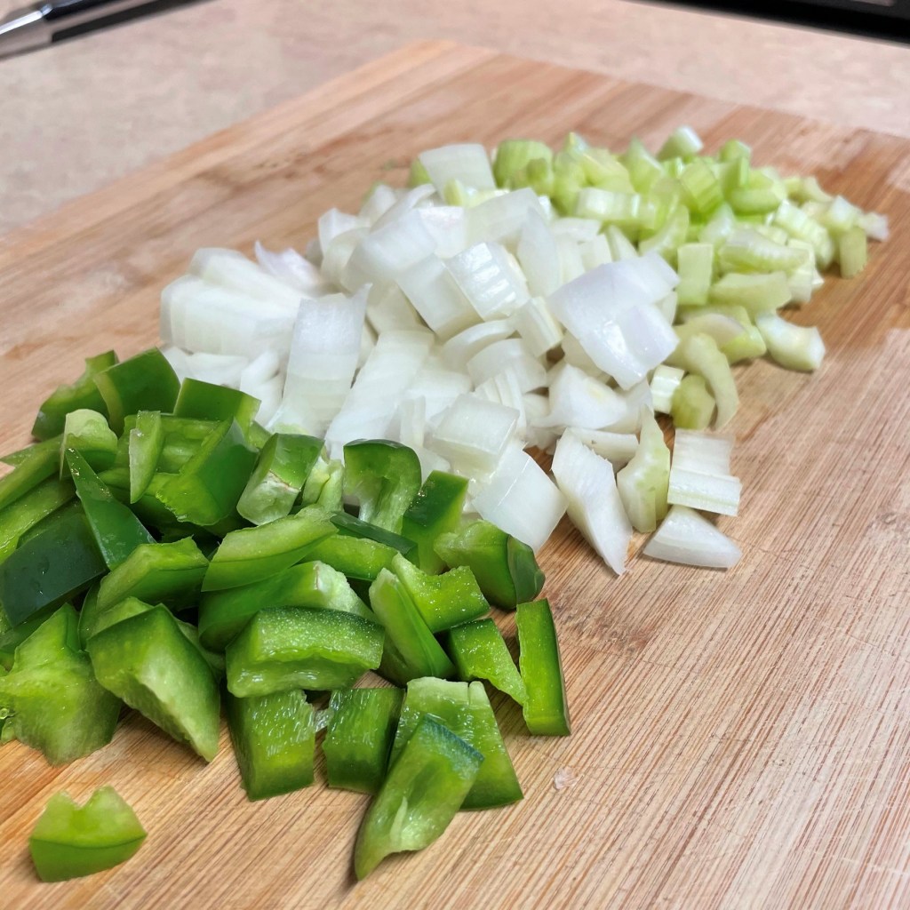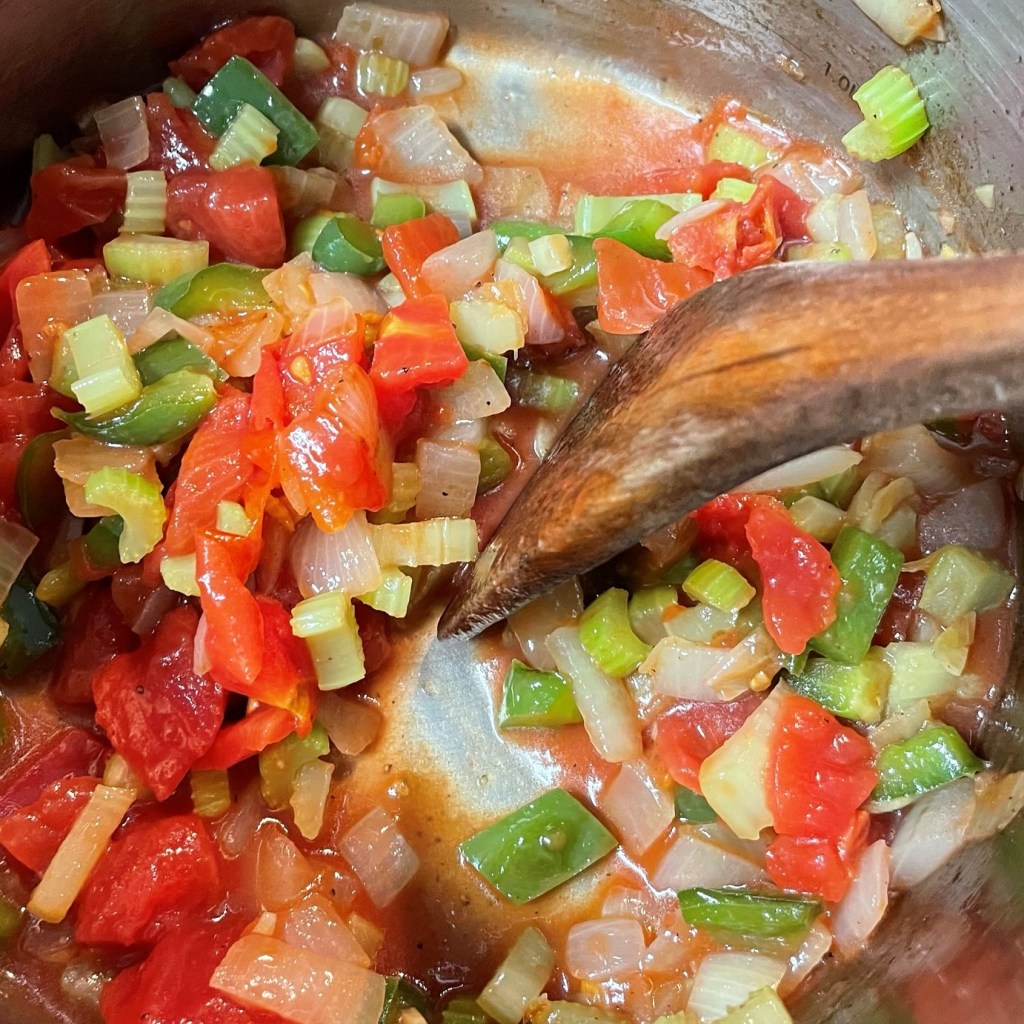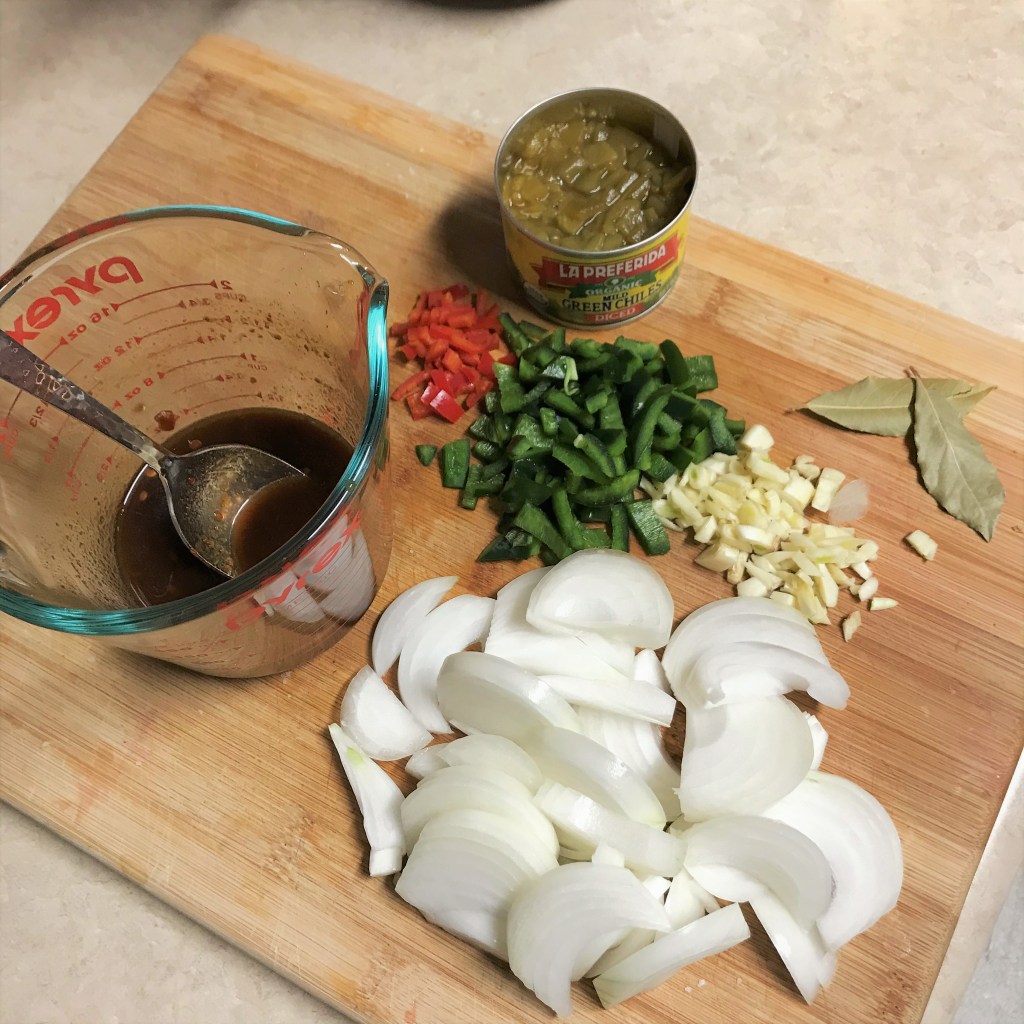 I placed my beans, covered with water, over medium heat with a couple of bay leaves, and got to work prepping the aromatics that would flavor my soup: onions, garlic, celery, red bell pepper and jalapeño.