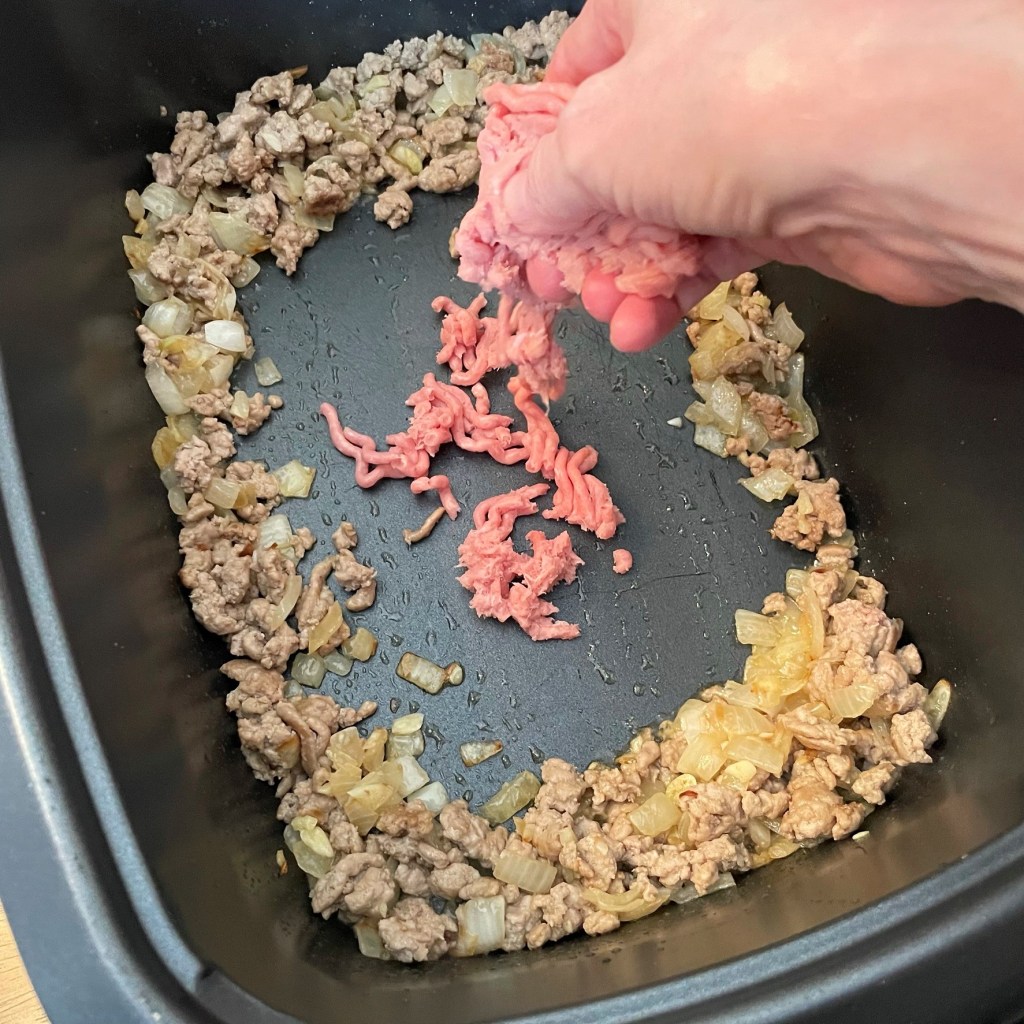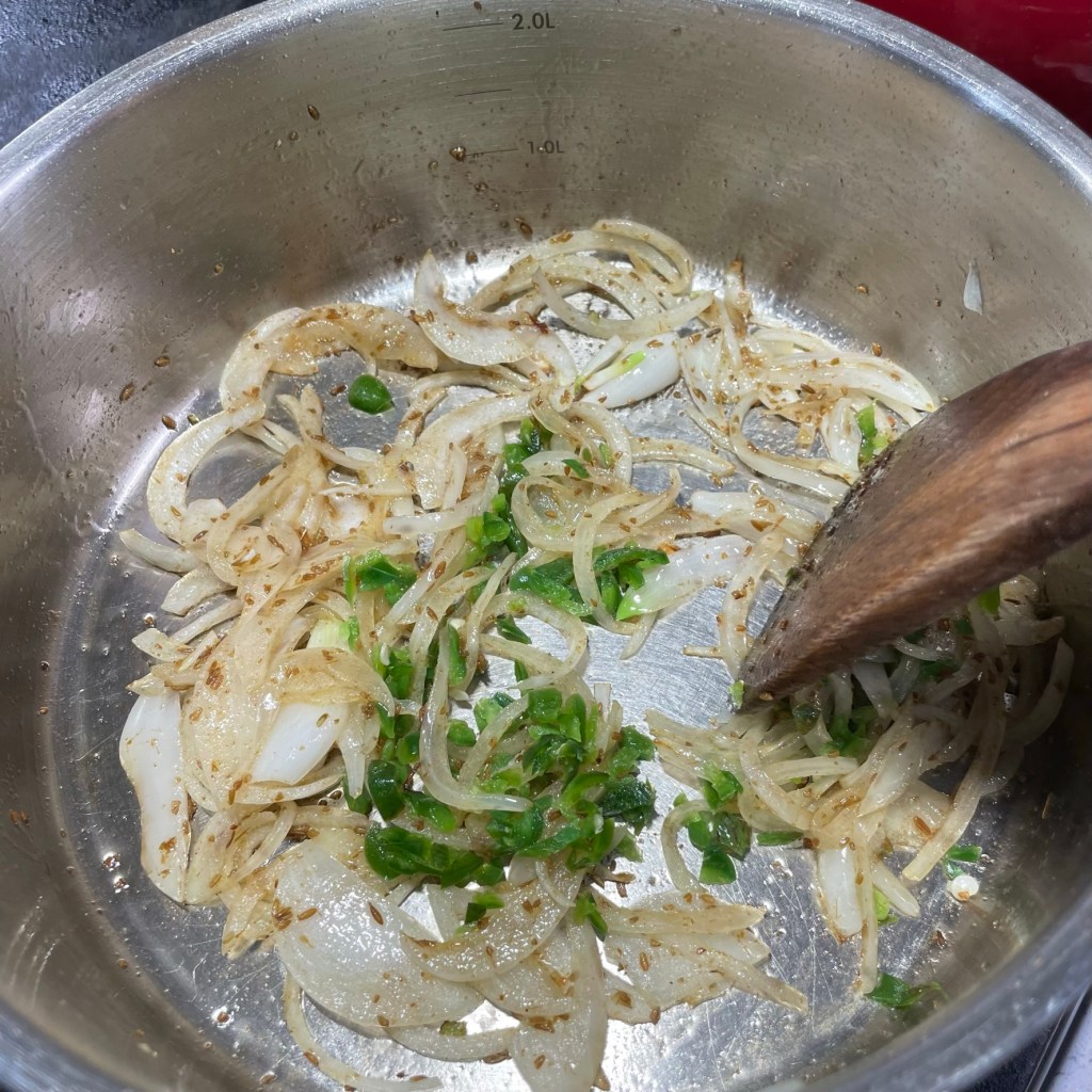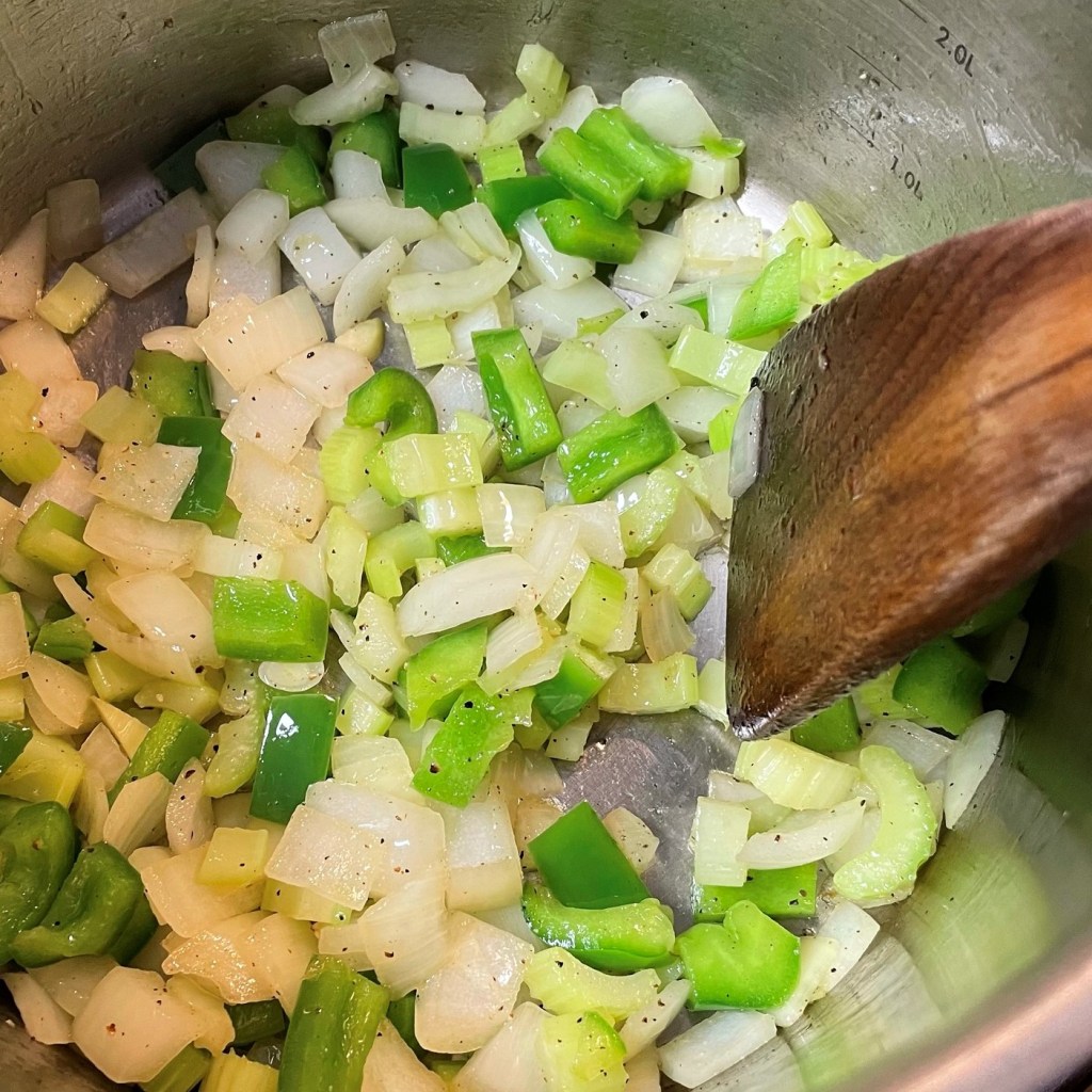 - Place a sauté pan over medium heat and add olive oil. Add onion, celery and pepper to the pan with a generous pinch of salt and black pepper. Sauté for about 3 minutes, until they are softened and slightly translucent. Add garlic and jalapeño and cook 2 more minutes. Season with cumin and chili powder. Set aside to cool.