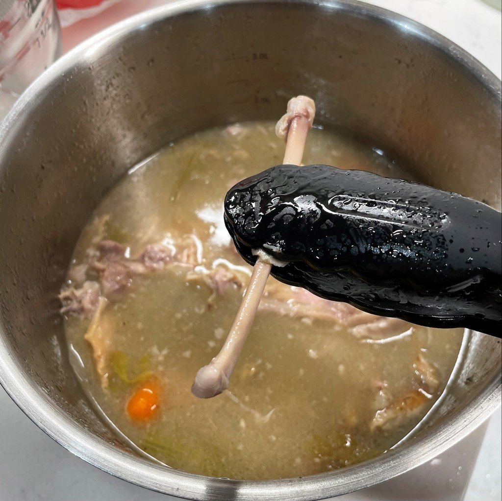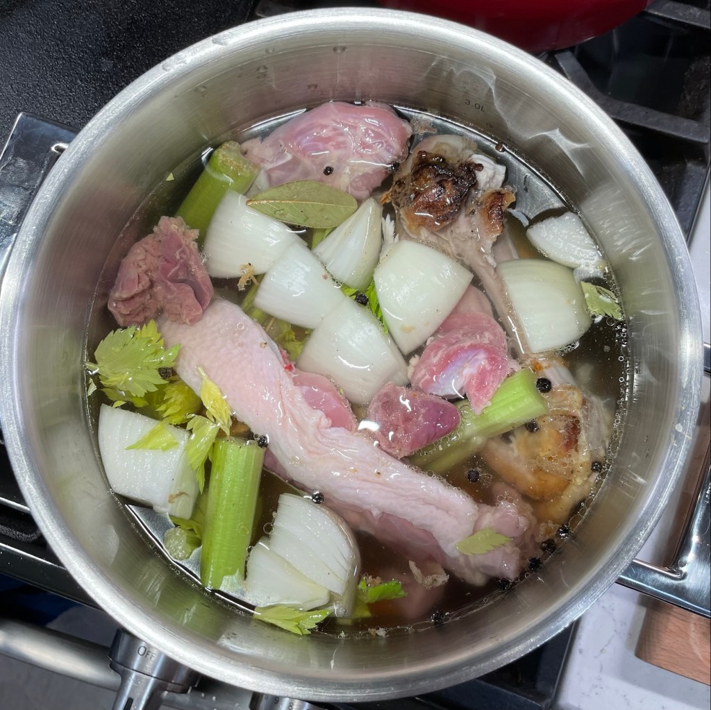 Believe it or not, I did have two bottles of clam juice in the pantry, because I’ve been jonesing to make chowder for over a year. The recipe called for three, but I didn’t mind keeping this on the thicker side. To bring a tiny bit of “Manhattan” into it, I tossed in a can of Rotel tomatoes which also brought another layer of heat, and that touch of acidity was perfect for balancing the flavors. Finally, my sliced Yukon gold potatoes (I didn’t have red), fresh thyme sprigs and dried bay leaves, and then it was time to simmer this hearty, chock-full-of-flavor autumn soup.