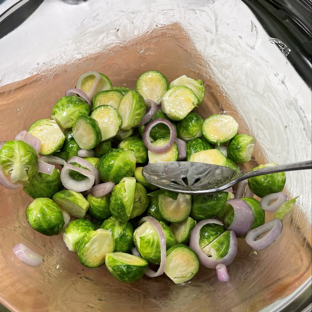 3. Add the trimmed brussels sprouts to the bowl and toss until evenly coated with the marinade. Use a slotted spoon to scoop them out of the bowl, and reserve the marinade that remains in the bowl. Arrange the sprouts, cut side down, on a parchment-lined baking sheet. Aim to separate them a bit so that they don’t steam from overcrowding. Roast for about 20 minutes.