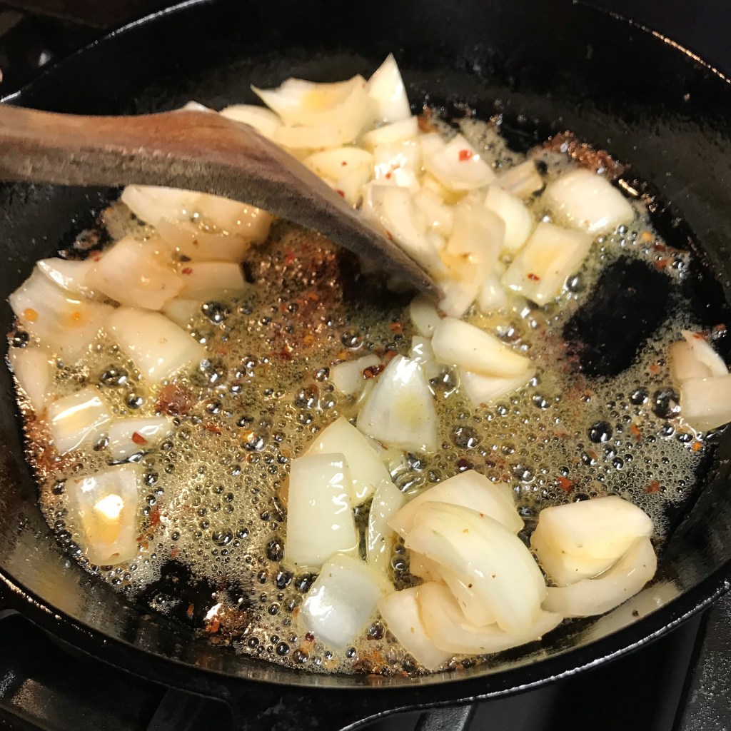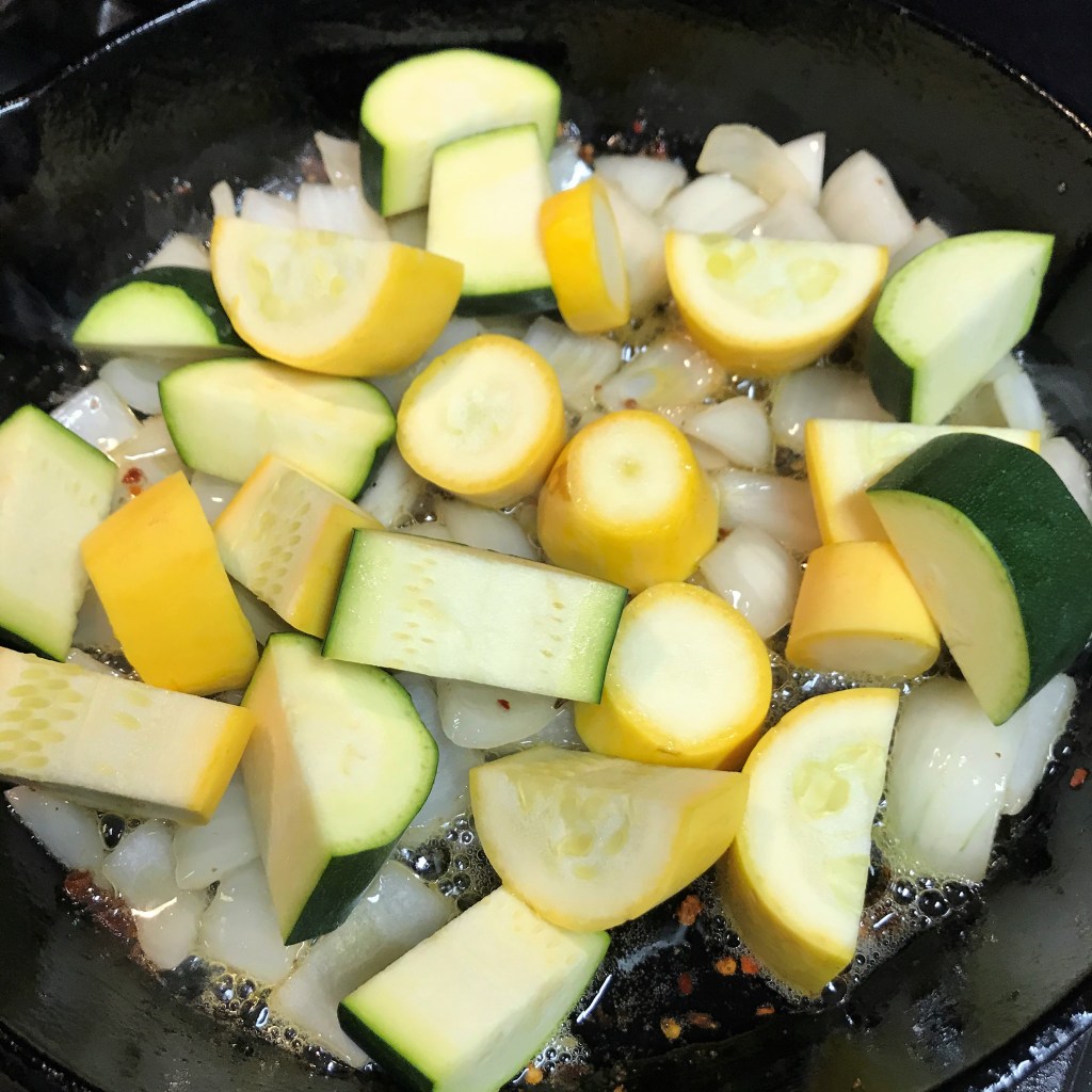 - Add chopped and minced vegetables and season with salt and pepper. Cook and stir until vegetables are softened and onions are slightly translucent.