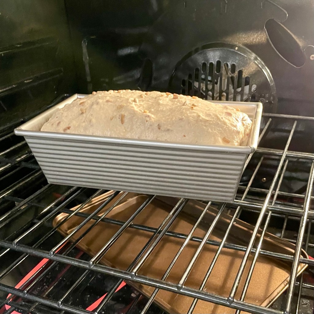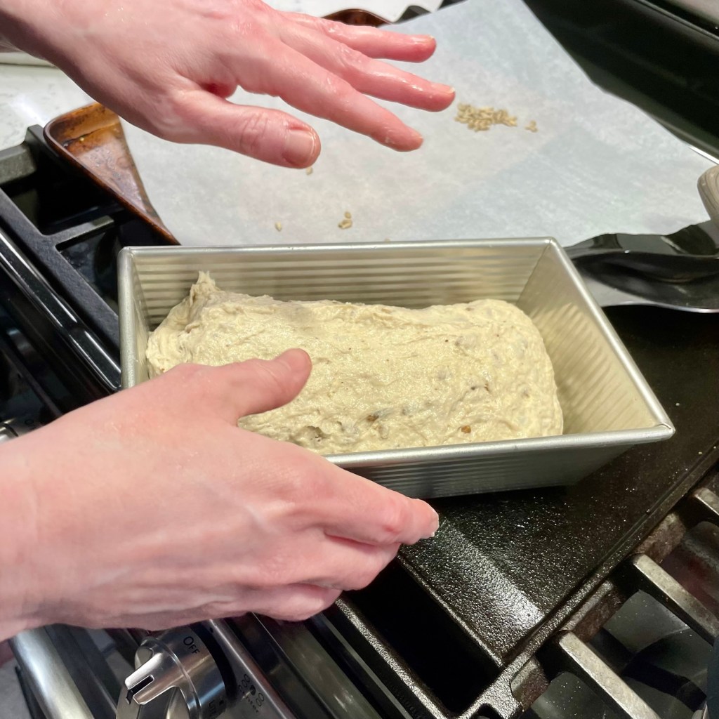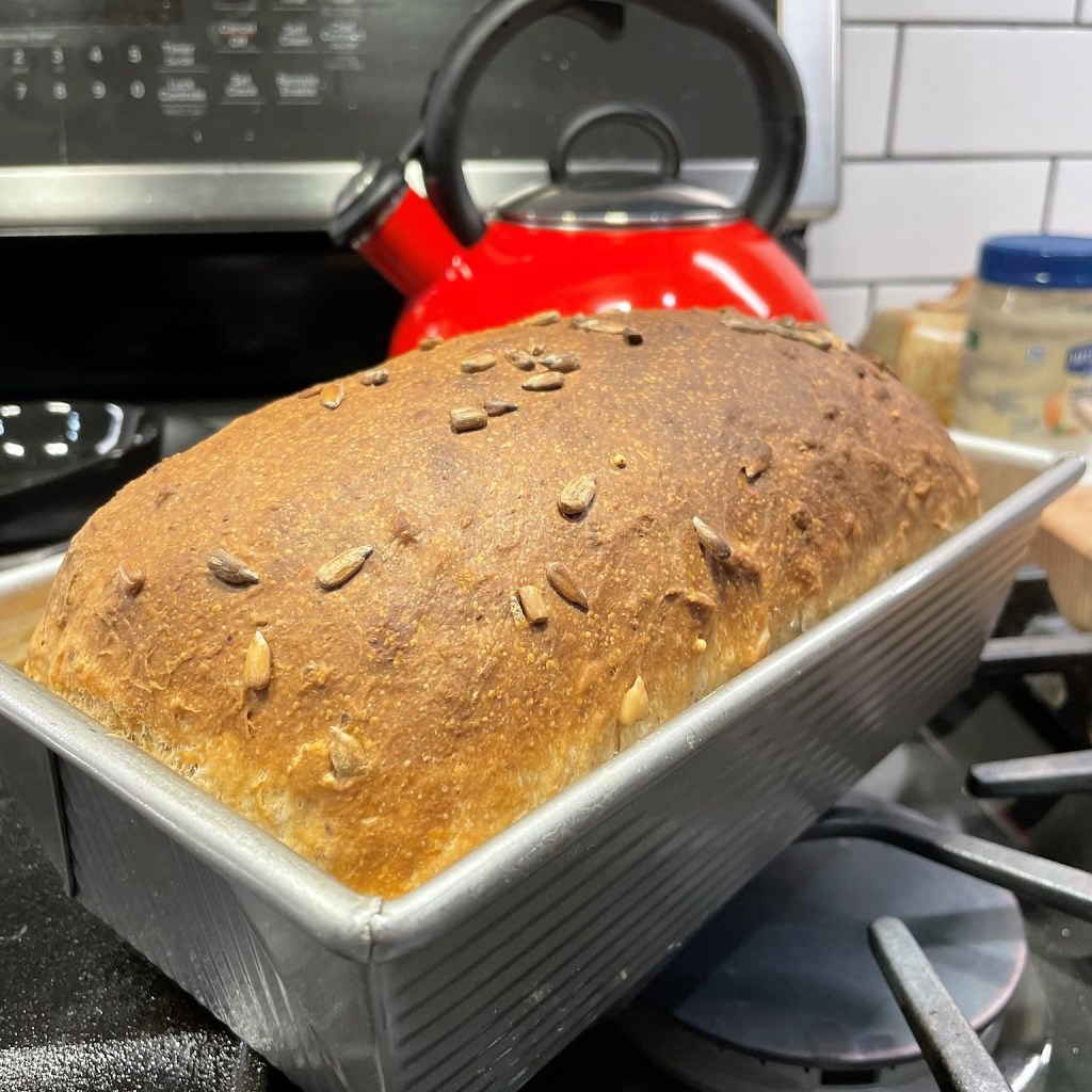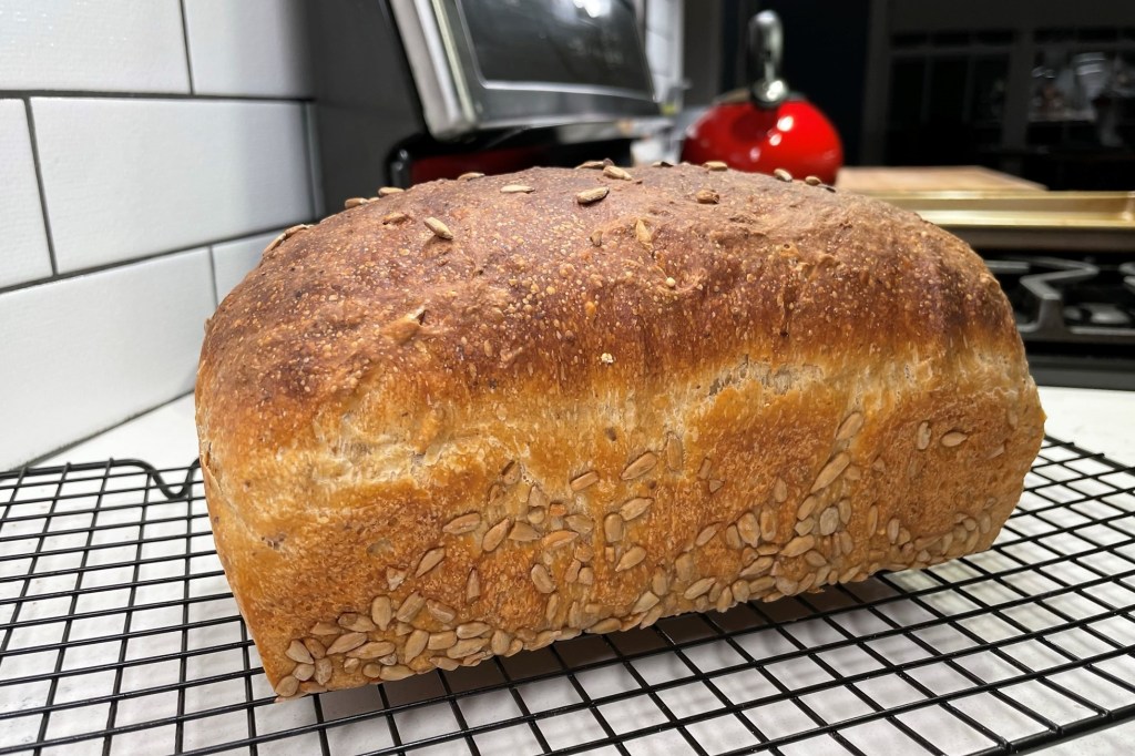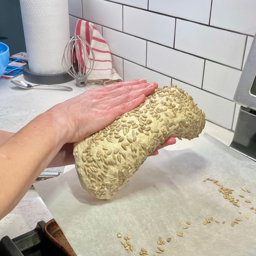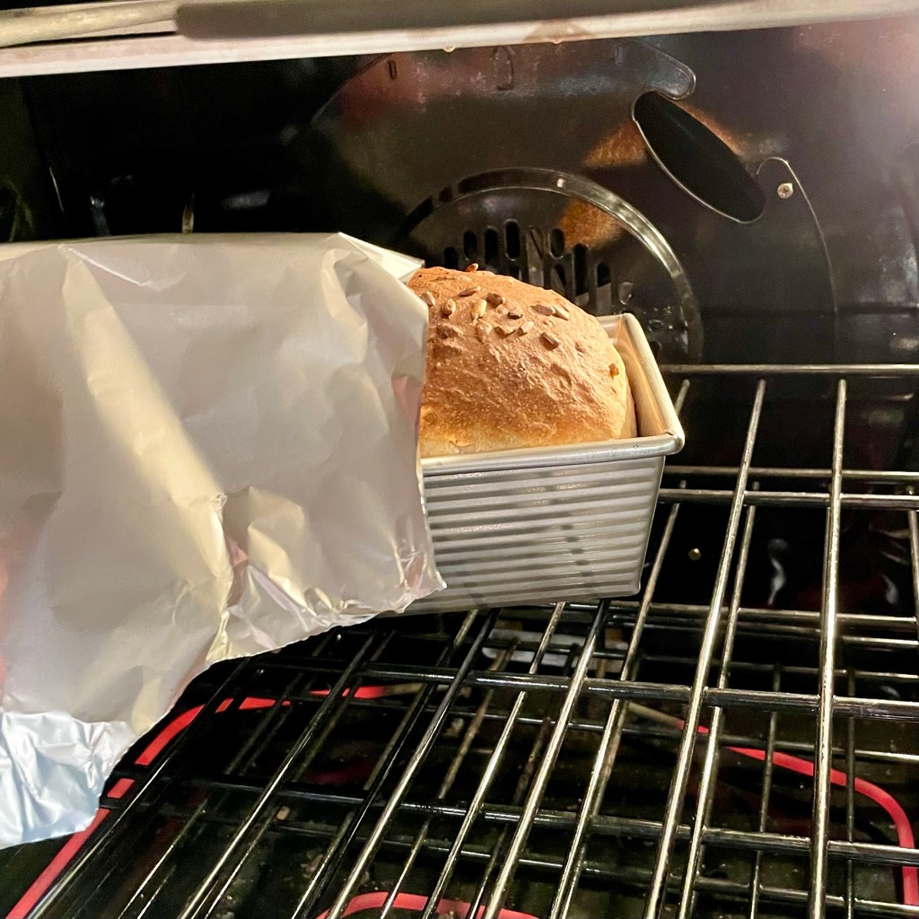 When the dough was ready for shaping, I used wet hands again to form a loaf, and then moistened the underside and rolled it lightly in additional sunflower seeds before placing it in my baking pan. Then, I baked the loaf as directed in my original post. Use a steam pan for the first 20 minutes, and a tent foil for the remainder of the baking time.