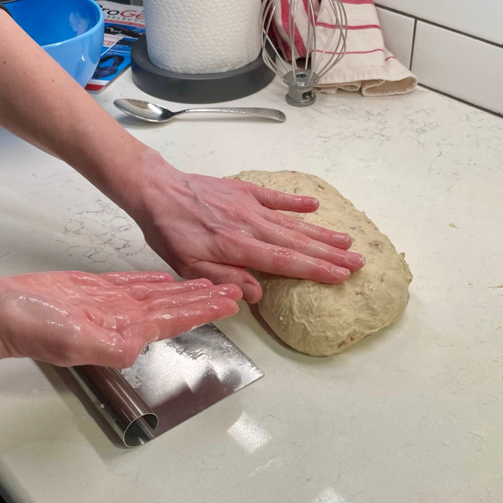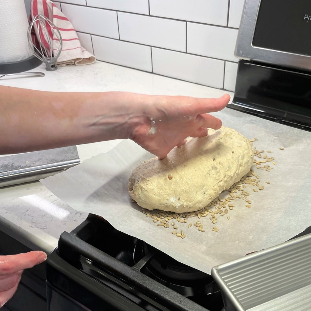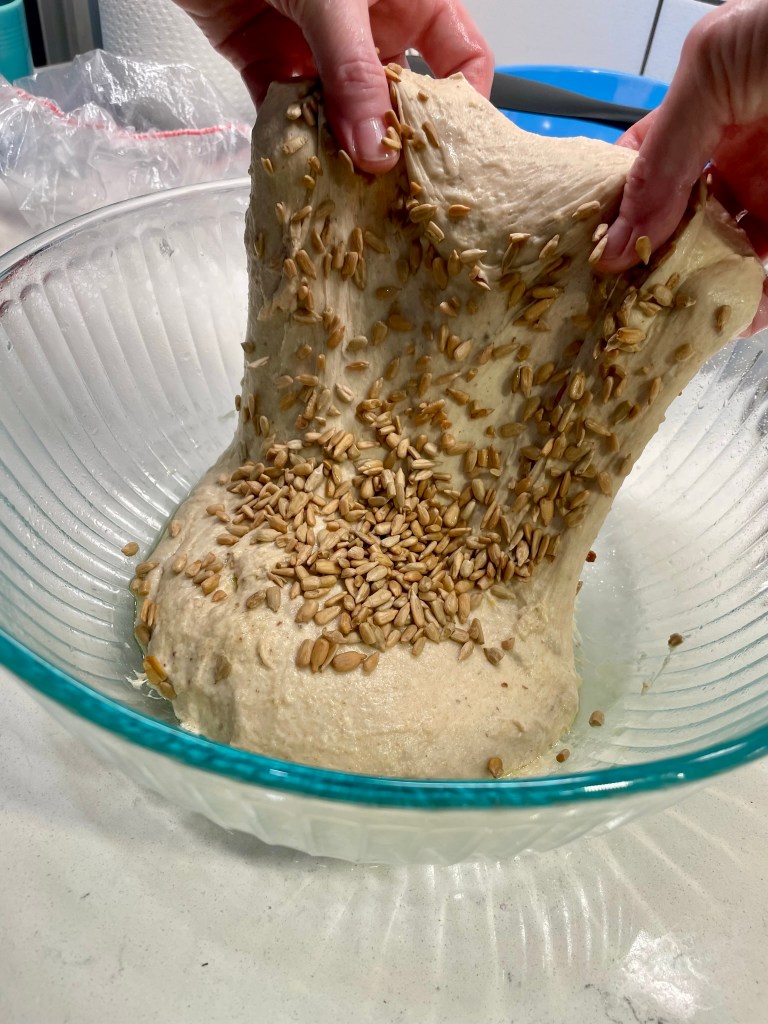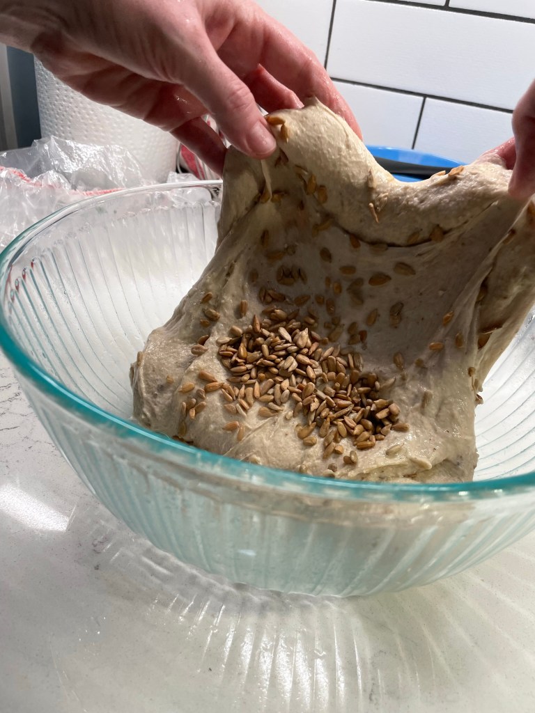 I swapped in a generous amount of white whole wheat flour as well as a portion of an ancient grains blend flour from King Arthur, called Super 10. This super-nutritious flour includes quinoa, buckwheat, amaranth and millet, among others. It gives my bread a flavor and texture boost without making it dense or heavy. I nearly doubled the amount of honey from my base recipe, and used the stretch-and-fold phase of the fermentation to fold in about a half cup of toasted sunflower seeds. This dough is very sticky, thanks to the ancient grains and high hydration, so use wet hands to complete the stretches. This is a gentle but effective way to knead the dough and incorporate the extra ingredient of seeds.