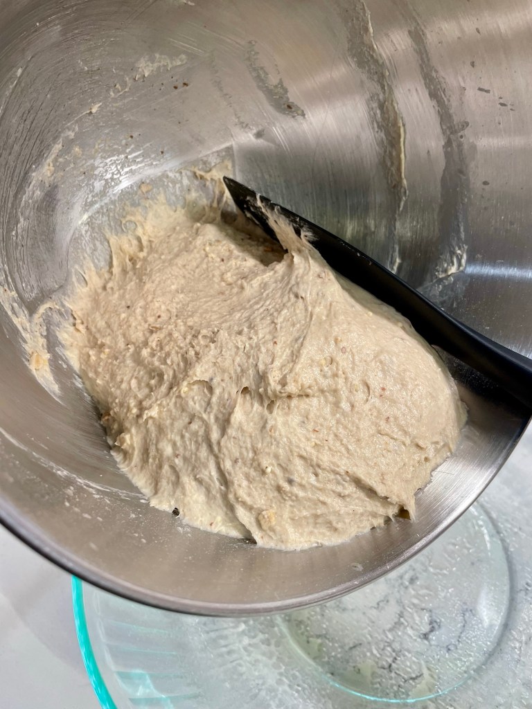 Rather than repeat all the instruction I’ve already given for my basic bread, I’ll point to what I did differently for this one, and trust you’ll find your way back to my earlier post if you need more visual information. This bread, like the other, depends on a portion of fed, ripe sourdough starter. It uses a special technique of pre-cooking a portion of the flour in milk, then cooling it before adding to the recipe.