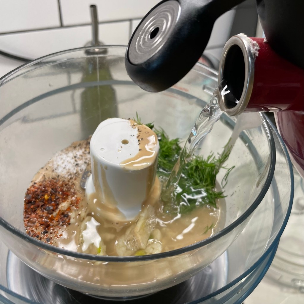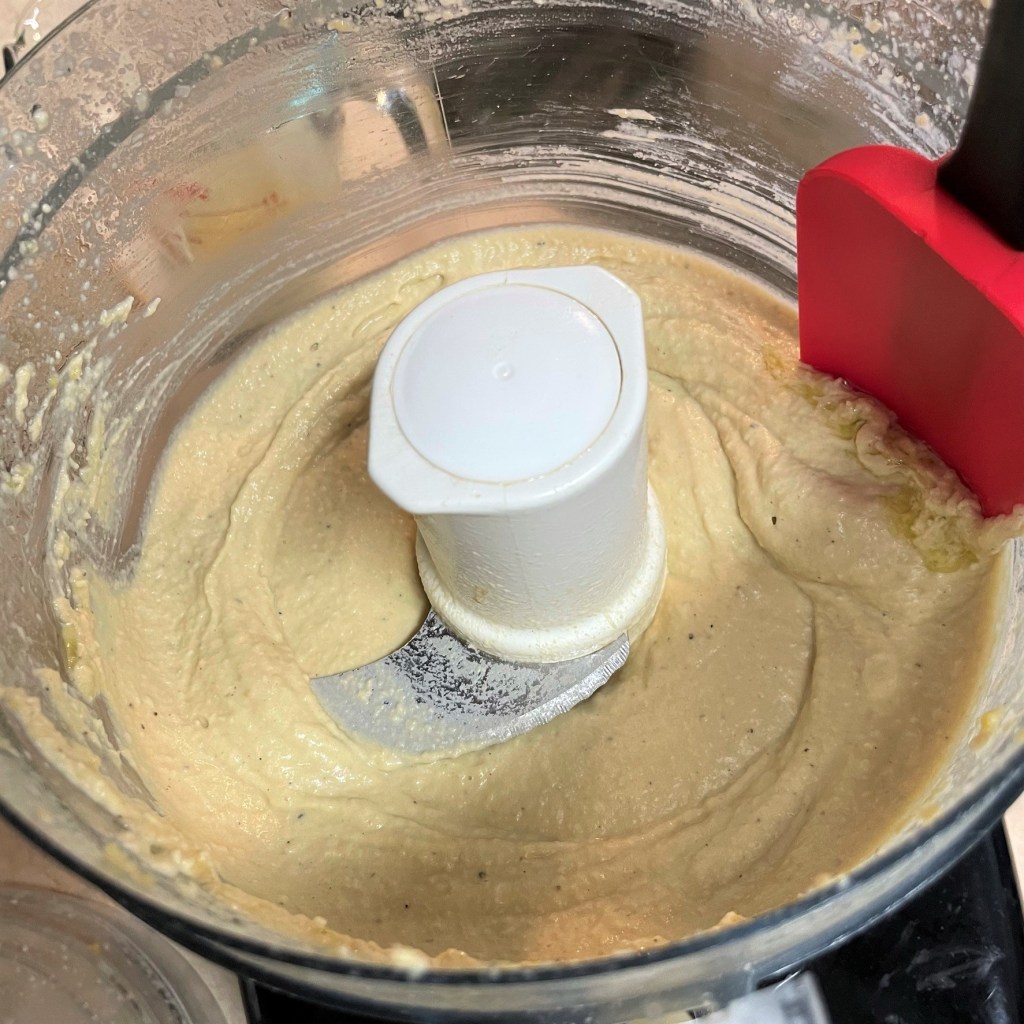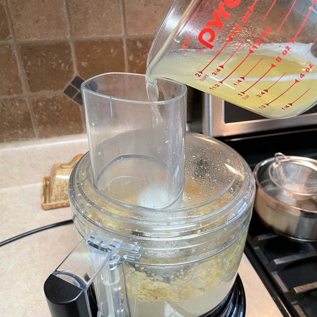 Turn processor on and run continuously while slowly pouring about 3 tablespoons of the warm liquid into the processor. Blending slowly will help to emulsify the ingredients into a smooth blend. Add more or less of the liquid, depending on your preference for hummus consistency. Remember that the mixture will become firmer after chilling. Scrape down sides once more.