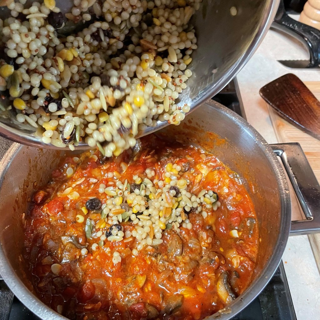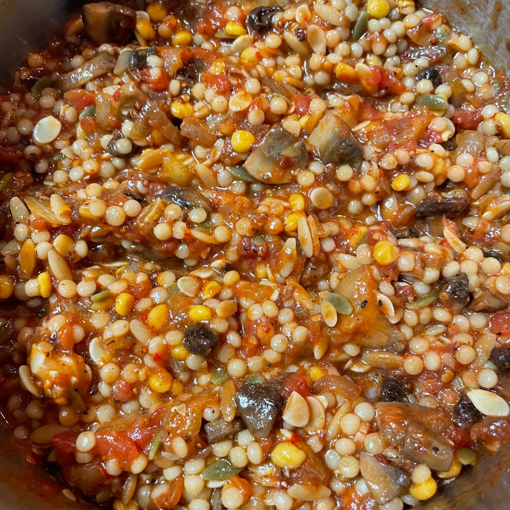 This time, I kept it entirely plant-based and gave it a spicy Moroccan twist. Israeli pearl couscous found its way into the mix, along with tomatoes, onions, mushrooms and garlic. I added a robust harissa paste for a big afterburn flavor. It was a double win for me—I got my wish for a hearty garden-based meal, and it was a fun flavor twist that my heat-loving hubby enjoyed, too.