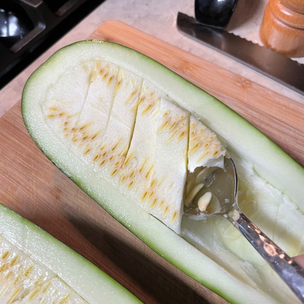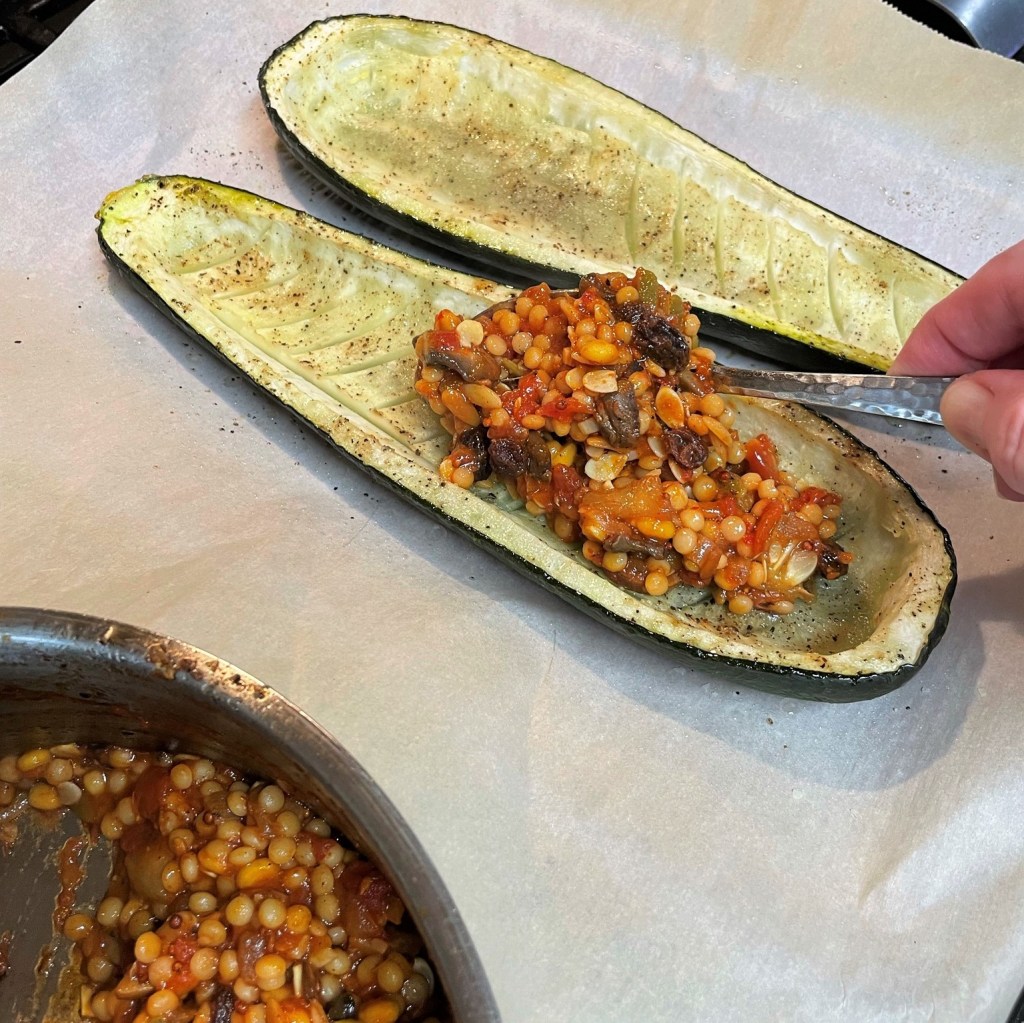 On our last visit to the market, I was specifically on the lookout for large zucchini because I wanted to make a “boat” out of it. I have enjoyed stuffed zucchini for years, dating back to my hometown days and first apartment meals. Through the years, I have made them with sausage stuffing, ratatouille flavors or Italian-themed ingredients, depending on what else I had in the fridge at the time.