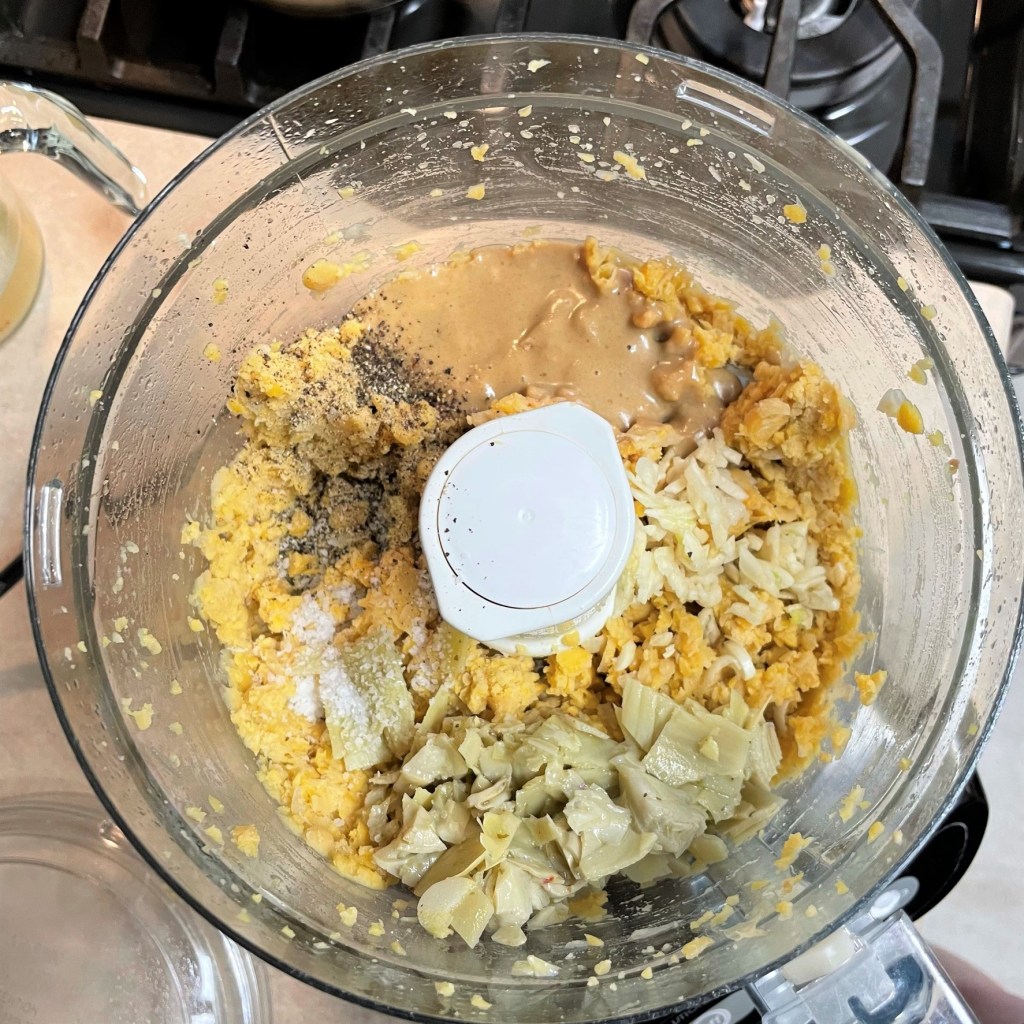Transfer warm beans into a food processor or blender and pulse a few times to grind the beans into a meal-like texture. Scrape down sides of the processor bowl. Add tahini, garlic, artichoke hearts, salt and pepper. Pulse a few times to combine. Scrape down the sides again.