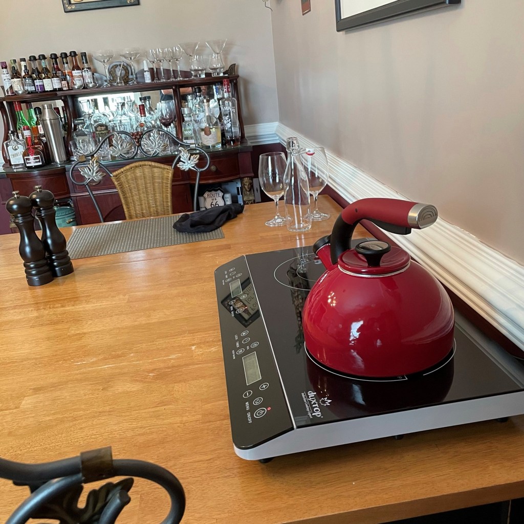 We have rearranged our dining room space to accommodate a baker’s rack that will hold some of the appliances that will help us get through the chaos. A new two-burner induction cooktop will allow us to do simple stove-top cooking, including heating water for my daily dose of French press coffee. We will make good use of our slow cooker, toaster oven and the panini griddle that doubles as a waffle iron. We have the gas grill for outdoor cooking, and so far, the only thing I haven’t quite figured out is how I will make bread without our oven, though don’t be surprised if I use one or more of the above to make it happen!