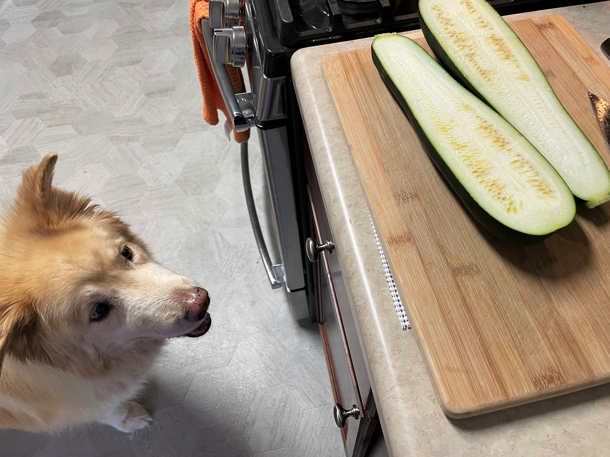 As usual, Nilla is ready and waiting for a piece of vegetable to fall! ❤