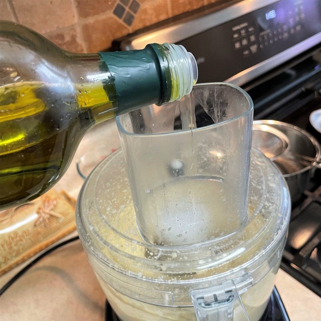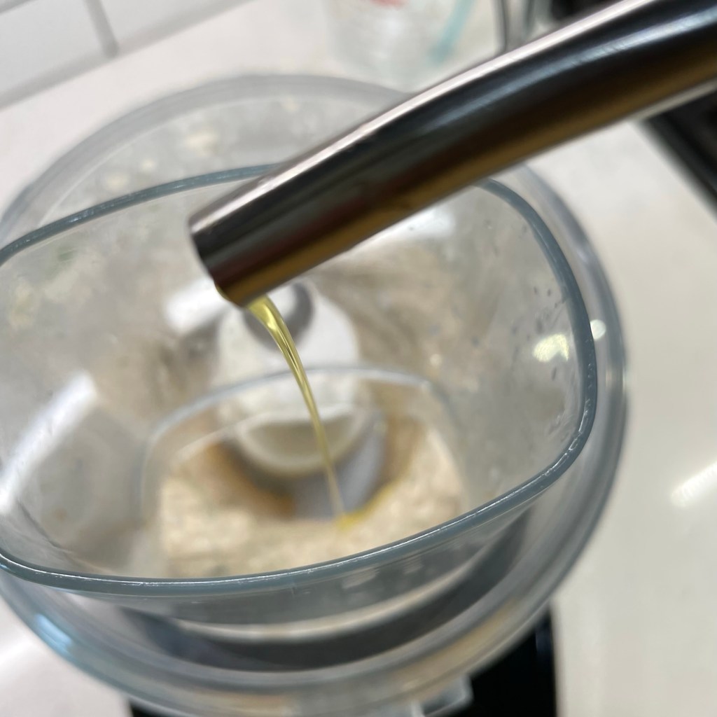 Drizzle the olive oil in slowly as the machine processes continuously.