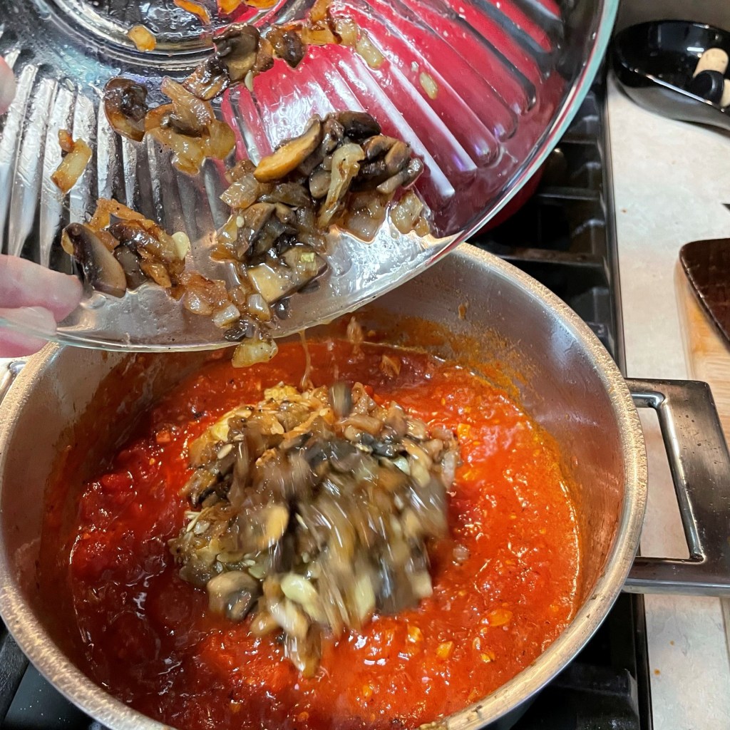 Return the onions, mushrooms and cooked zucchini bits to the pot to blend with the sauce.