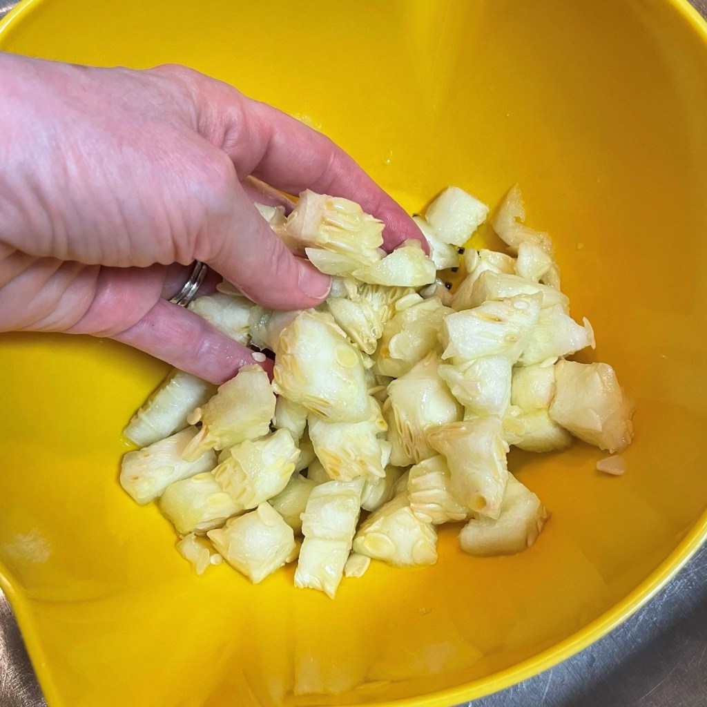 Make shallow cross-cuts through the flesh to section it.