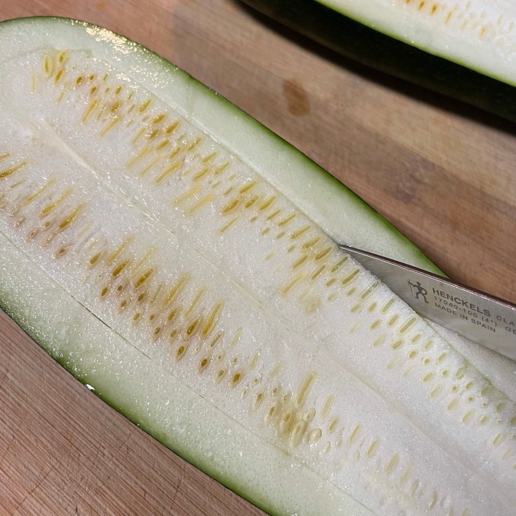 To remove the zucchini pulp neatly, use a paring knife to score around it, keeping 1/2 inch on all sides.