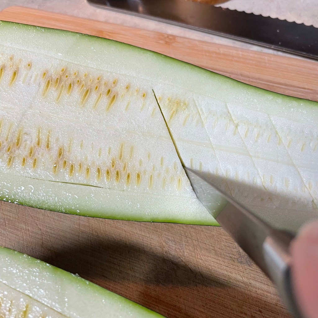 Cut the zucchini in half lengthwise, then score the inside to scoop out the seedy flesh. Cut the flesh up into chunks and toss with salt in a colander to remove excess moisture.