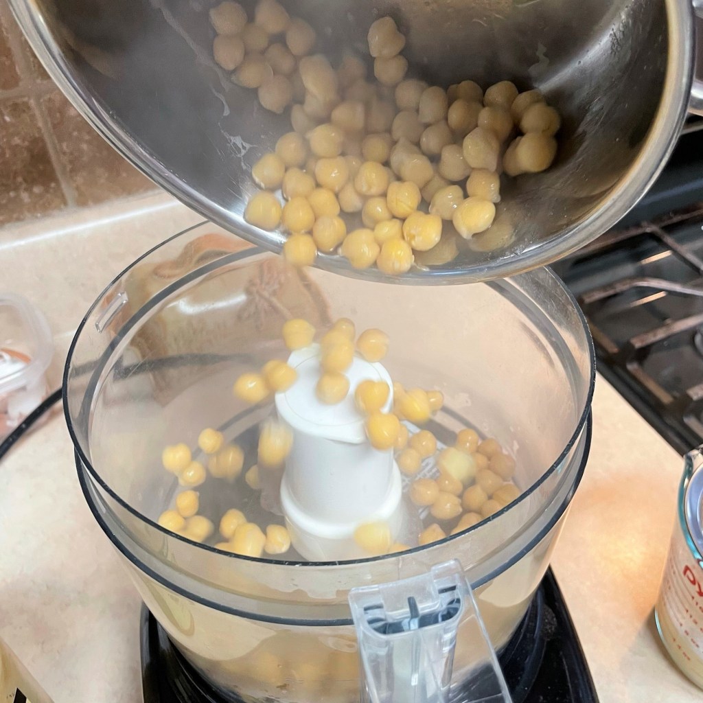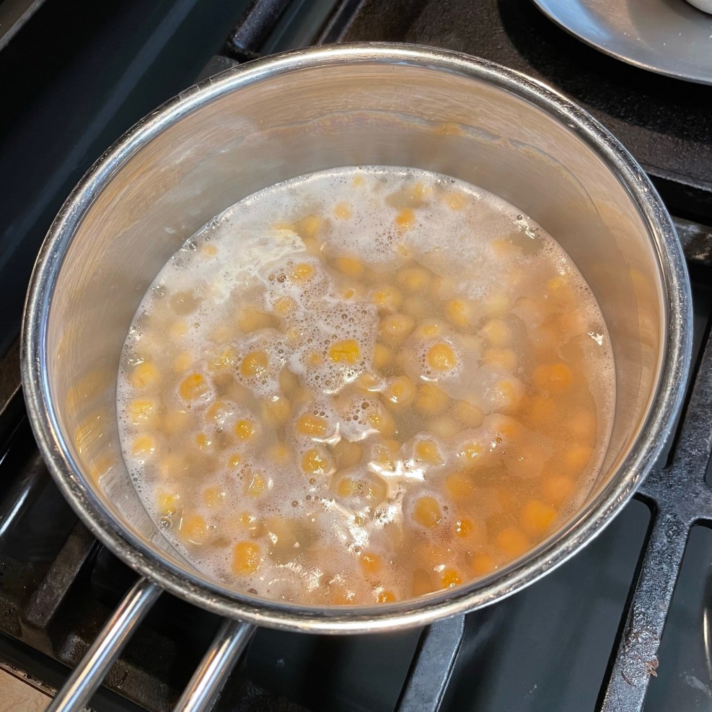Simmering the garbanzos softens them, and helps achieve a silky texture in the hummus.
