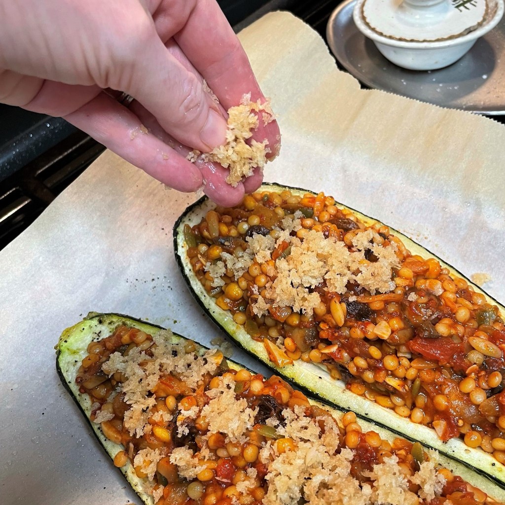 Sprinkle the “buttered” panko crumbs on top of the filling, and send the boats back into the oven.
