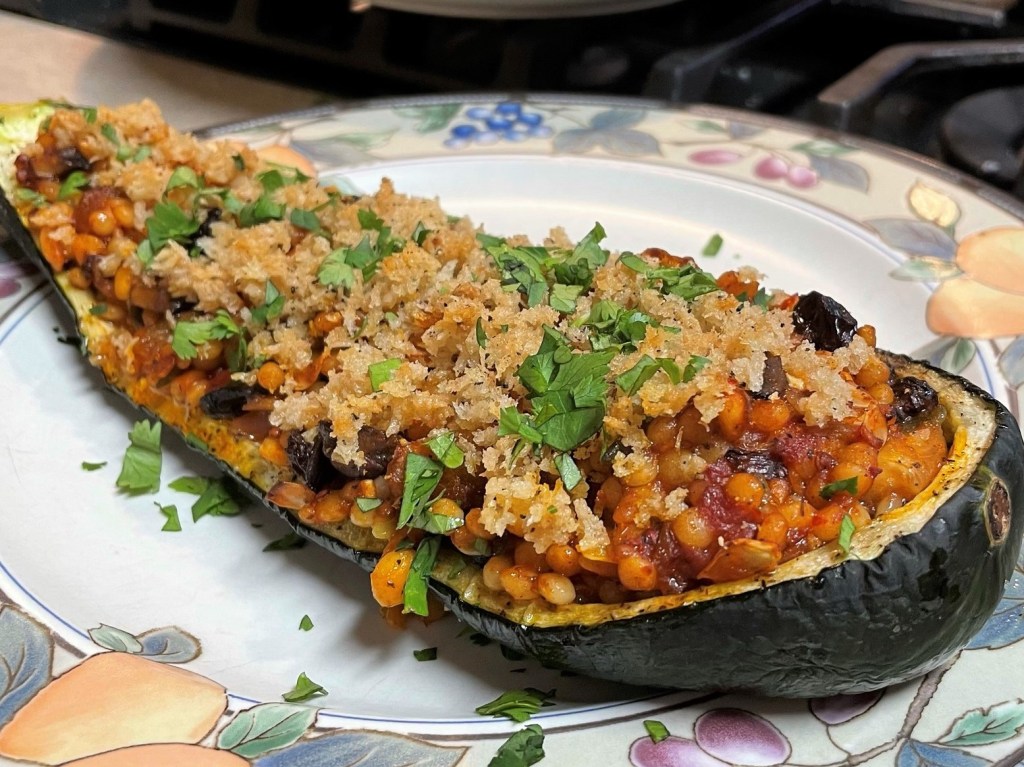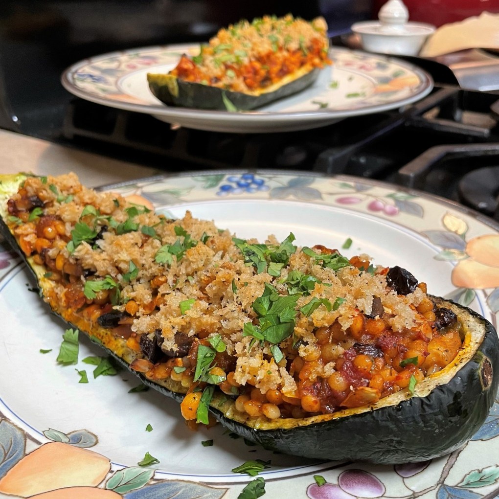 Spoon the couscous filling into the zucchini shells. Top with buttered panko crumbs. Return the zucchini boats to the oven and bake until crumbs are browned and crispy. Serve with chopped parsley sprinkled on top.