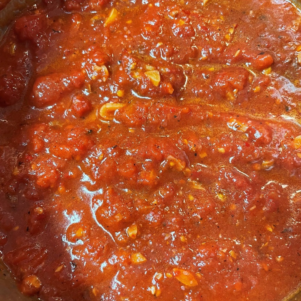 I almost always have San Marzano tomatoes in play in my kitchen, and half of a 28 oz. can was about right for this recipe. Use a standard can of diced tomatoes or, obviously, go for fresh! 🙂