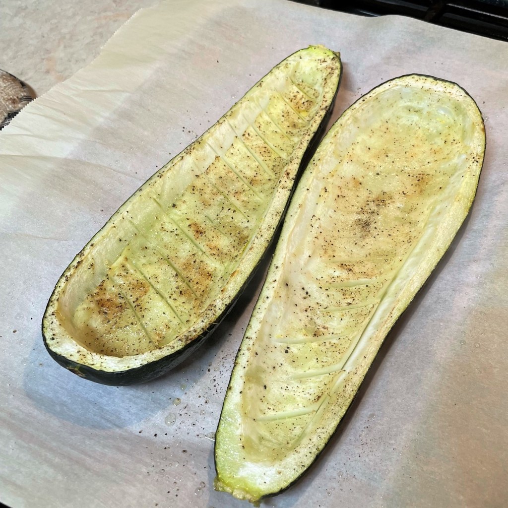 Large zucchini, halved lengthwise and insides scooped out