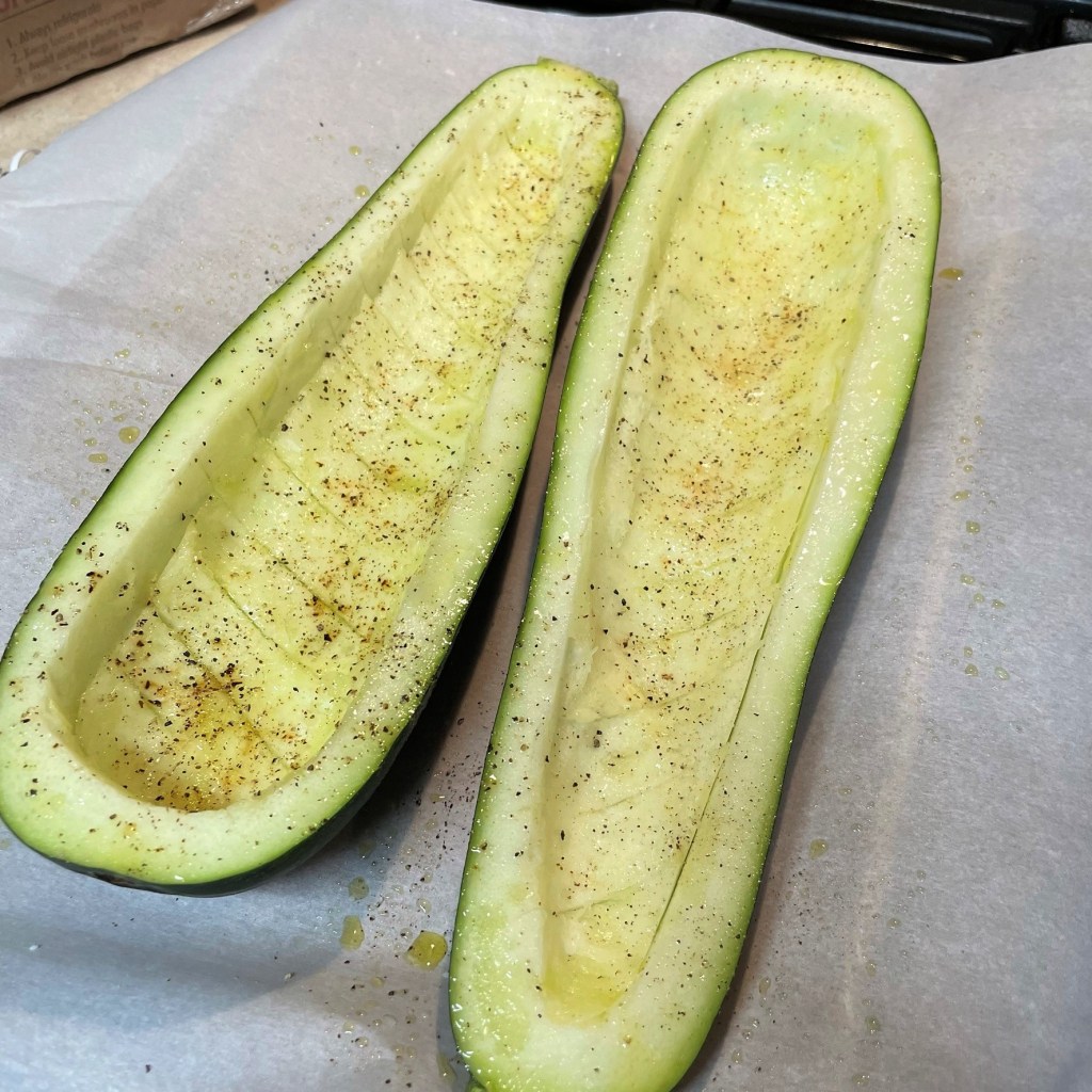Prep the zucchini for roasting with a quick spray of olive oil, plus salt and pepper. Into the oven for about 40 minutes.