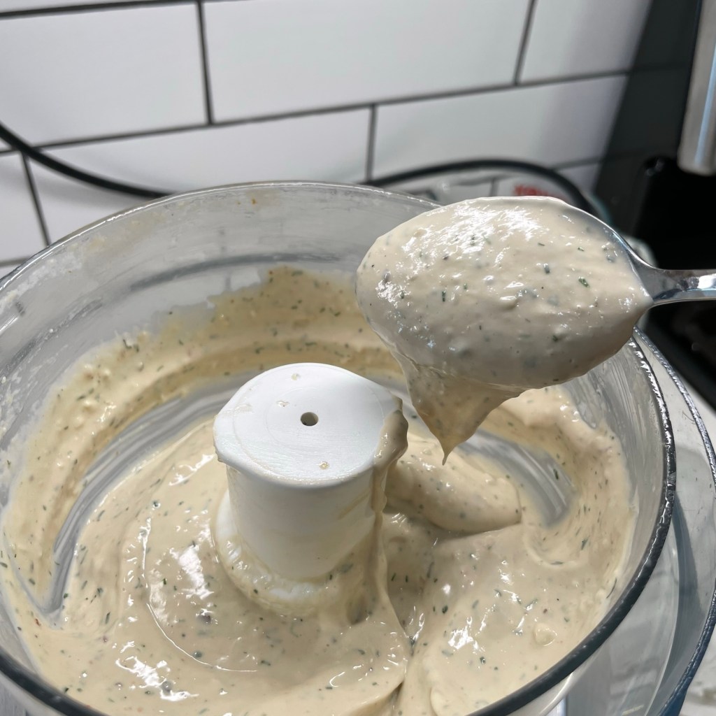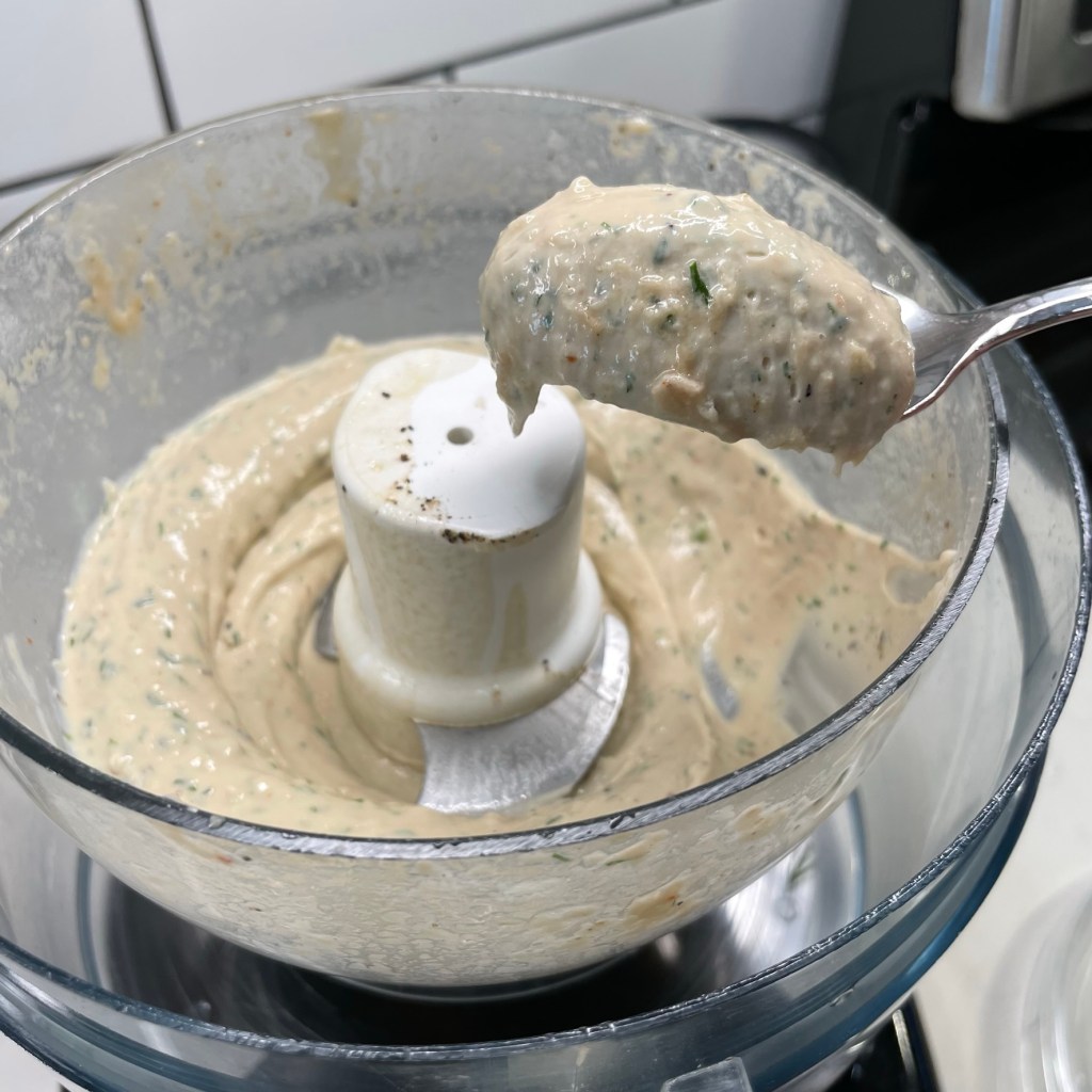 Run processor continuously and slowly blend in about 3 tablespoons of extra virgin olive oil.