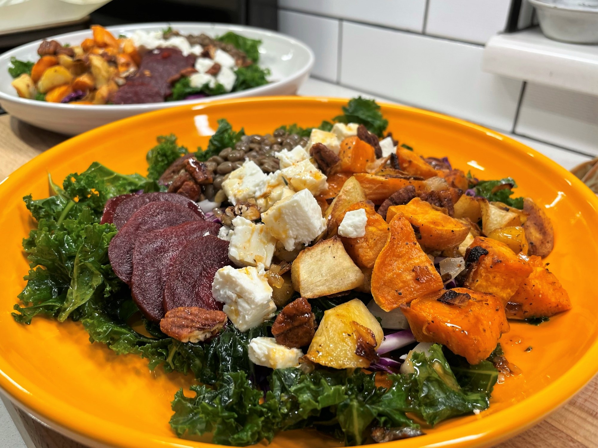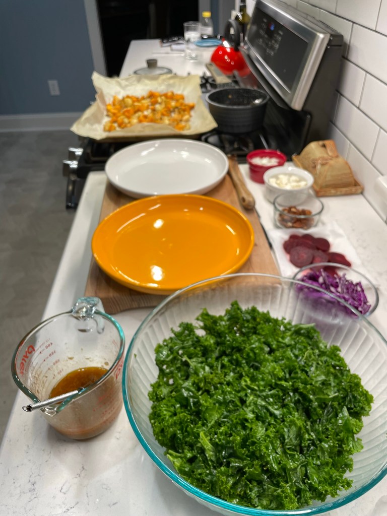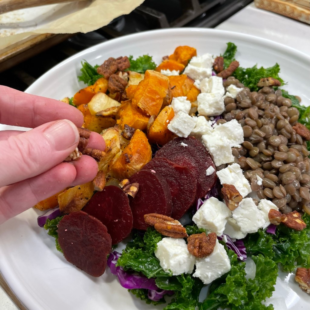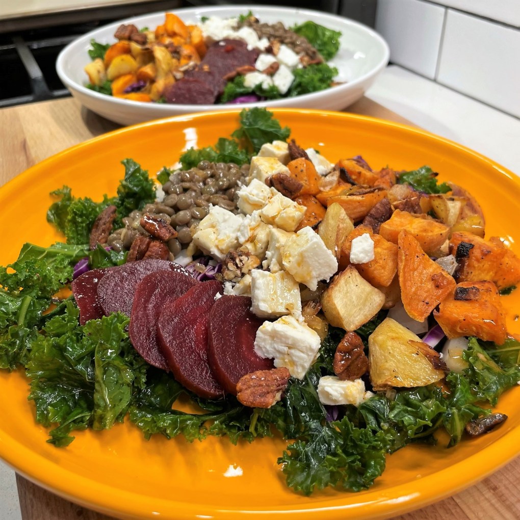 It’s why I’ve been dreaming of this salad, and I finally made it last night in my own attempt to shake off the midwinter blues and blahs. My original intent was to make it a few weeks ago, and I had purchased all the ingredients to make it happen, but then we got Covid in our house—as if January, on its own, wasn’t miserable enough—and all bets (and burners) were off. Luckily, most of my ingredients for this vibrant, flavorful salad are sturdy; the sweet potatoes, cabbage, parsnips and onions kept well, and the only thing I had to buy new was the kale. Beyond that, the salad has so many things I love—tender lentils, cooked beets (I used store bought), feta, toasted pecans and a spectacular smoked maple-sriracha vinaigrette that appeared to me in a dream not long ago.