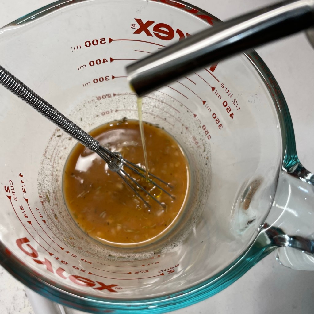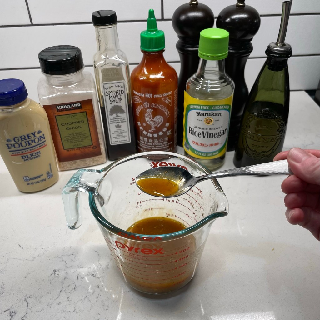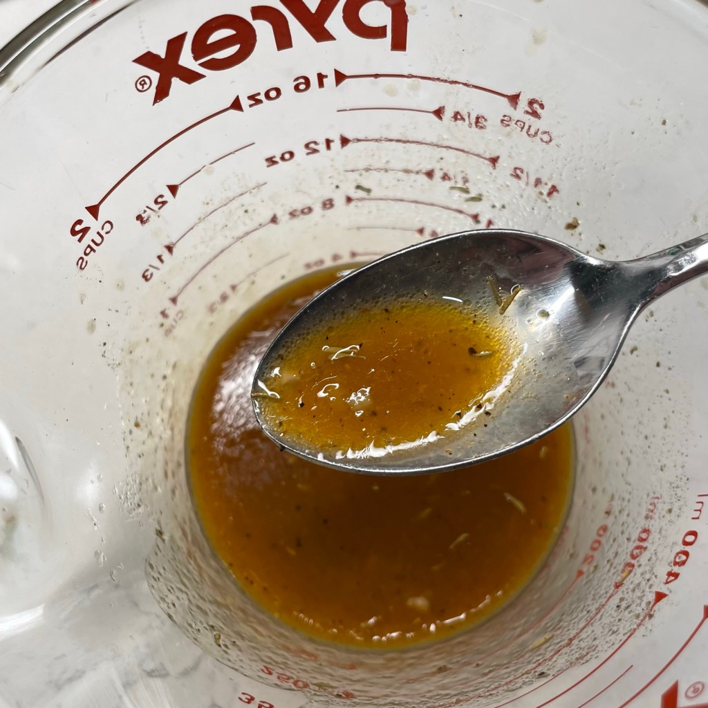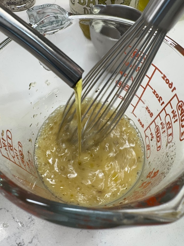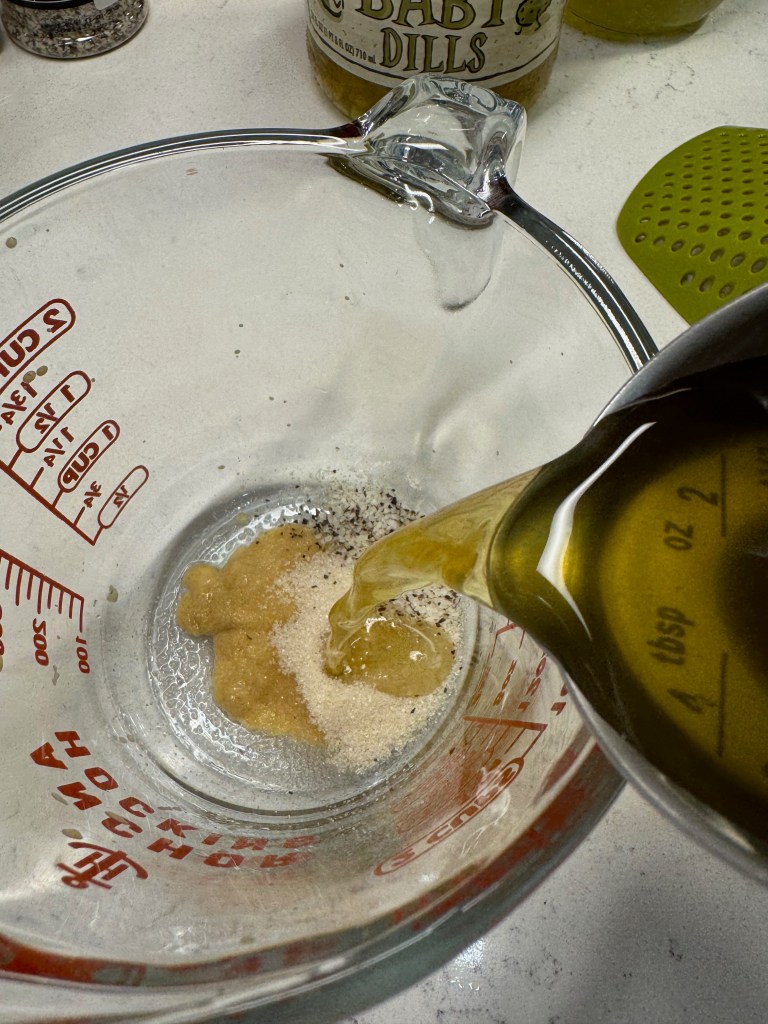 The balance of the dressing recipe is Dijon mustard, a spoonful of sugar, dill and celery seeds, and a healthy drizzle of extra virgin olive oil. Salt and pepper to taste, plus a splash of water, and that’s done.