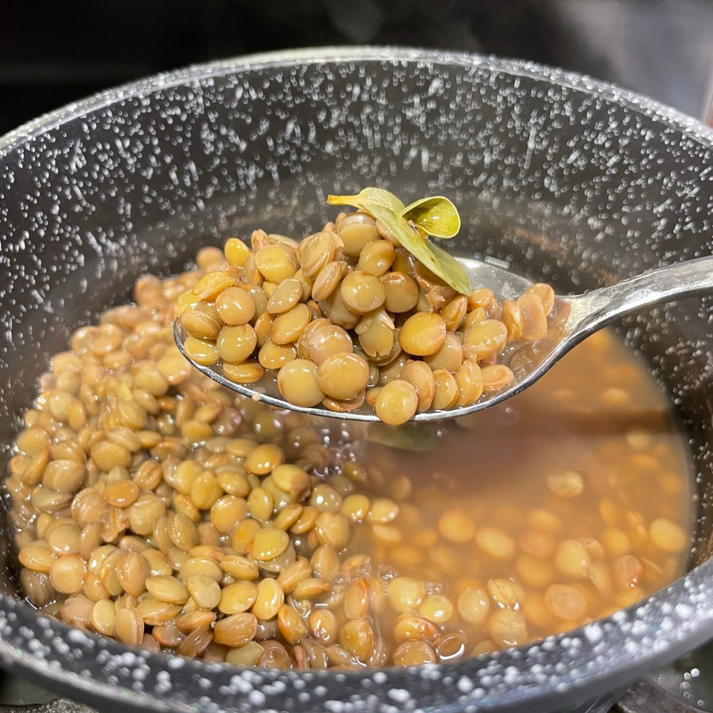 Cook lentils according to package instructions, using low-sodium vegetable broth in place of some or all of the water. During simmer, add a bay leaf to the pot. Drain excess liquid when lentils reach desired tenderness. Transfer to a bowl and cool completely. Add salt to taste.