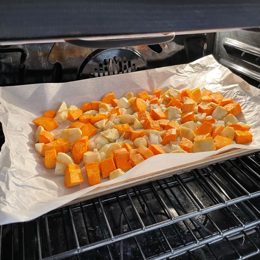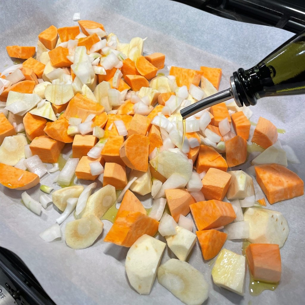 1/4 cup extra virgin olive oil, divided (you’ll use a tablespoon to roast the sweet potato and the rest to sauté vegetables in the pot)
