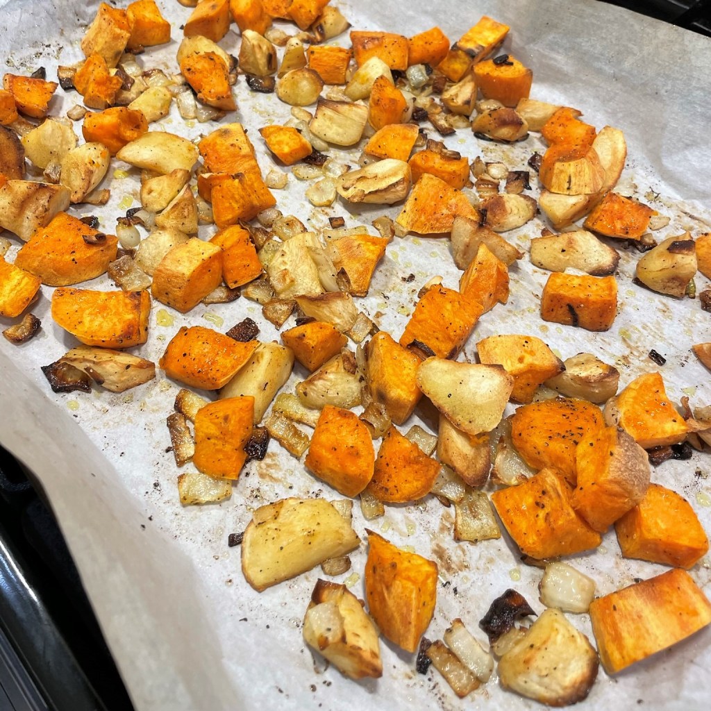 Toss the cubed sweet potatoes with enough olive oil to lightly coat all sides. Spread onto a parchment-lined baking sheet and season with salt and pepper. Roast at 400° F until they can be pierced with the tip of a paring knife and are only slightly firm to the bite. Cool completely.