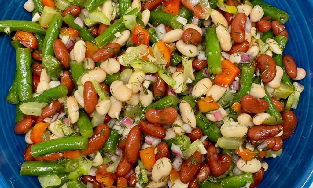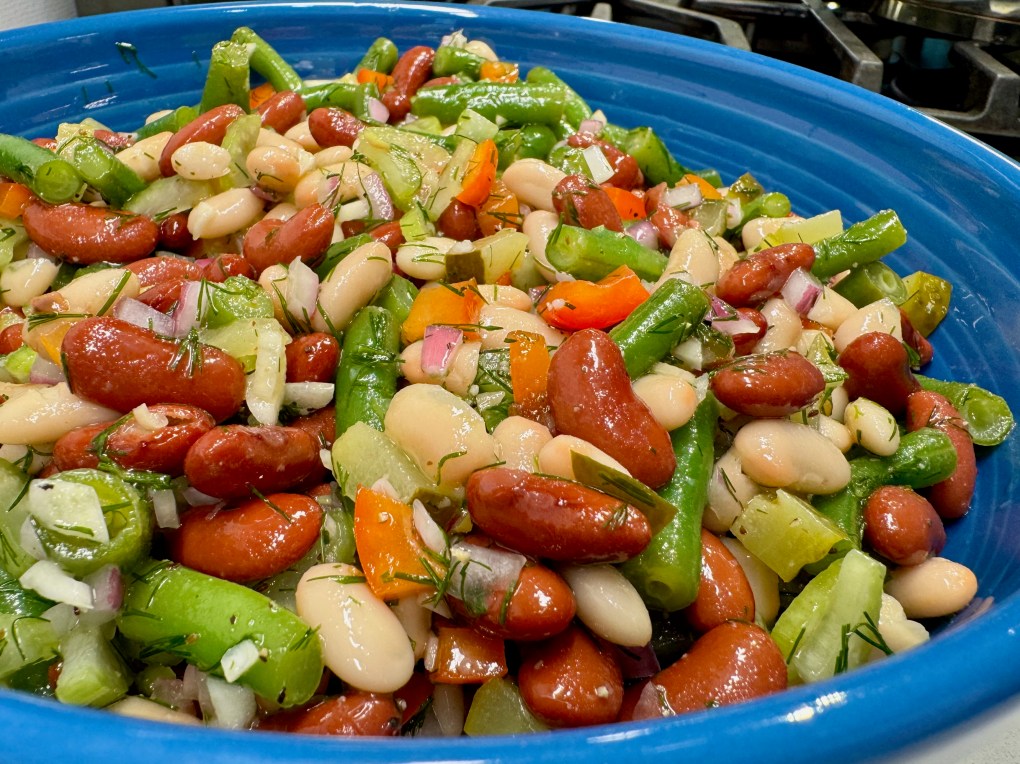 This variation on three-bean salad has even more texture than my usual, with crunchy bits of celery, bell pepper and red onion, the zesty bite of minced garlic, creamy kidney and cannellini beans, and a big punch of dilly-dilly flavor, courtesy of chopped spicy pickles and fresh summer dill. The fresh green beans have a nice “snap,” and the canned beans provide terrific fiber for a healthy gut, along with enough protein to carry me through this god-awful heat spell. Let’s get into it!