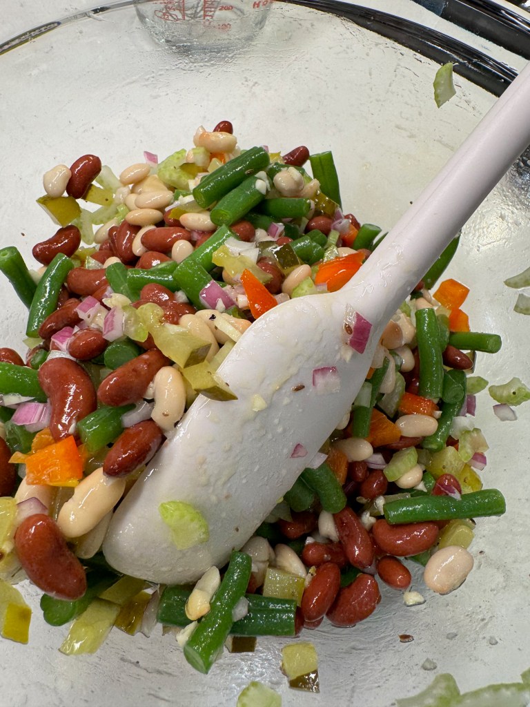 Blot the green beans with a towel to remove excess moisture. Combine in a large bowl with the drained canned beans, vegetables and chopped pickles.