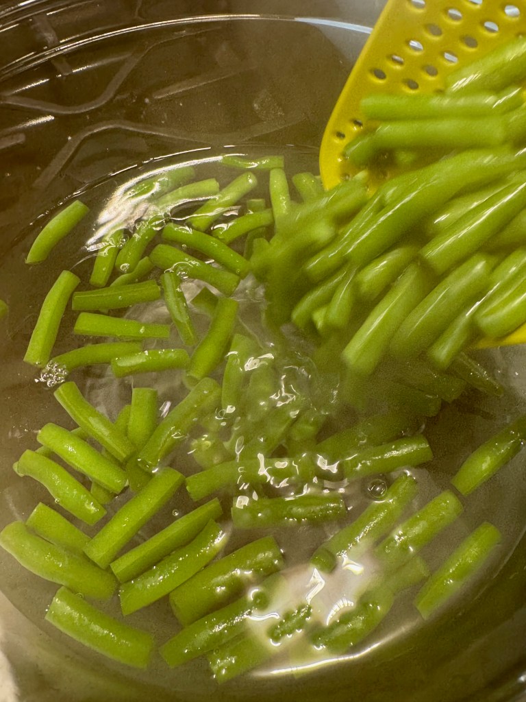 Test a bean or two for doneness after about five minutes. They should be tender but still give a little resistance to the bite.