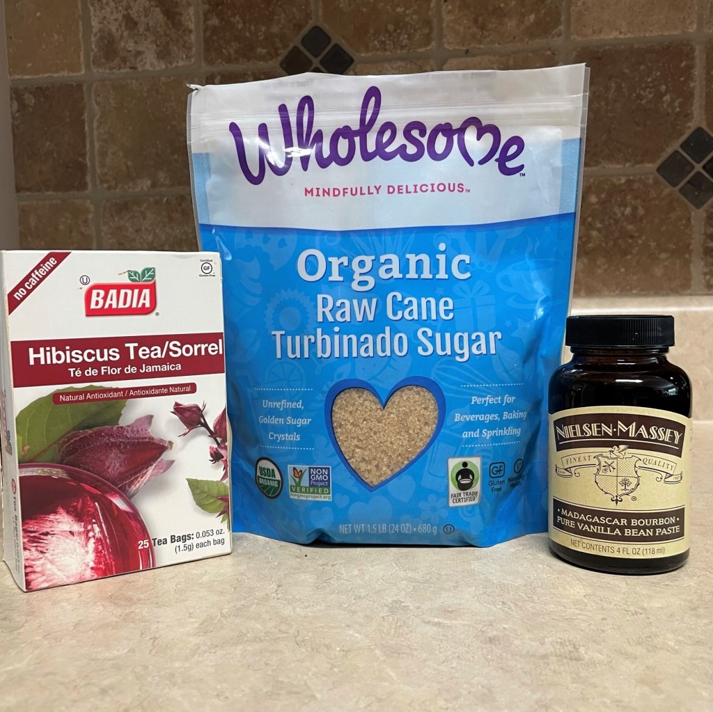 Turbinado sugar has a warm, rich, molasses-y flavor. The hibiscus tea adds tartness and deep red color, and the vanilla lends a familiar spice note.Dissolve 1/4 cup turbinado sugar in 1/2 cup water, then add three hibiscus tea bags to infuse the syrup with color and flavor. Steep several minutes, strain and chill.Add a bar spoon (about 3/4 teaspoon) real vanilla paste to the hibiscus syrup.Let the syrup cool, then transfer to a jar or bottle. It will keep in the fridge about 3 weeks.