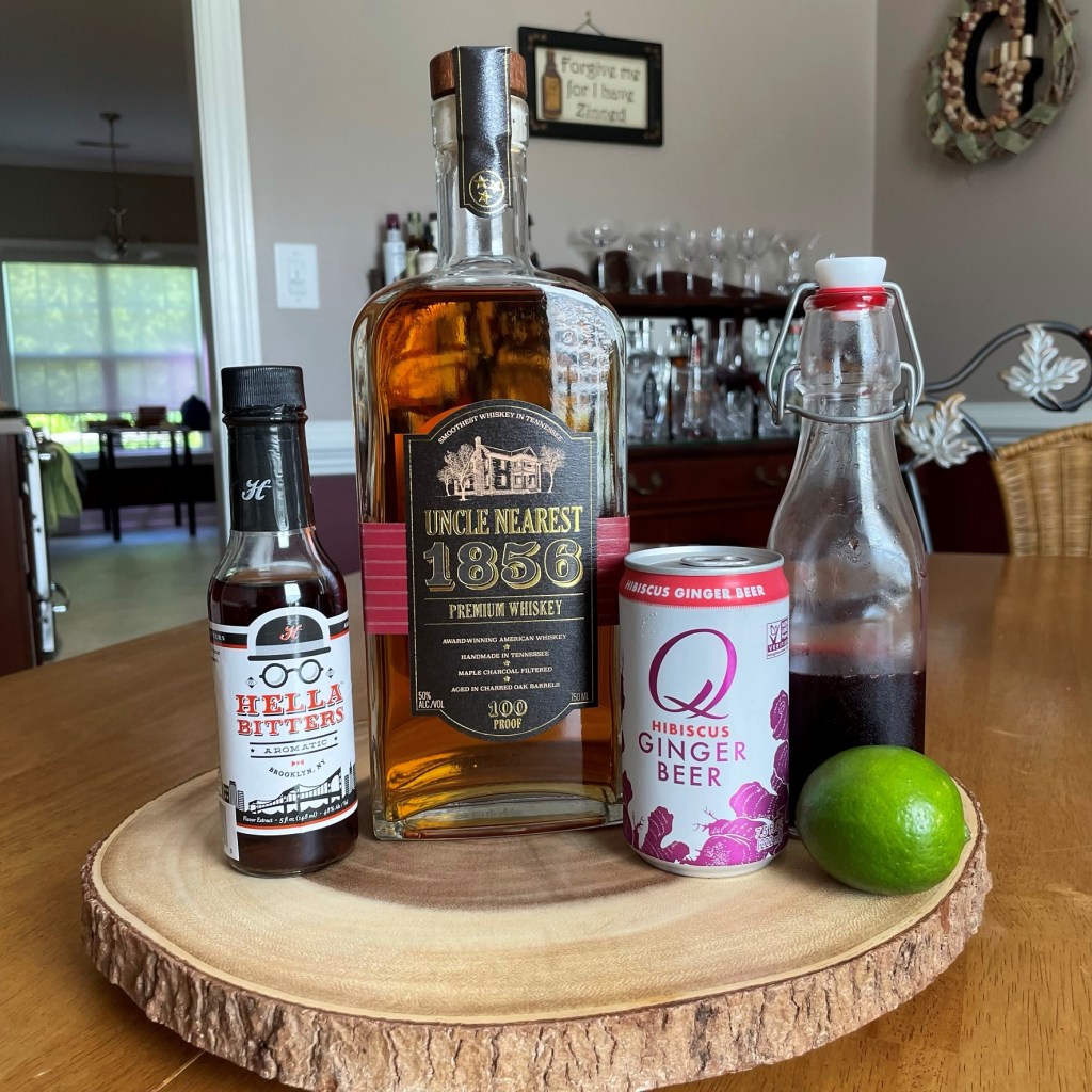 I’ve paired the Uncle Nearest whiskey with hibiscus syrup and ginger beer, plus aromatic bitters and a touch of fresh lime.